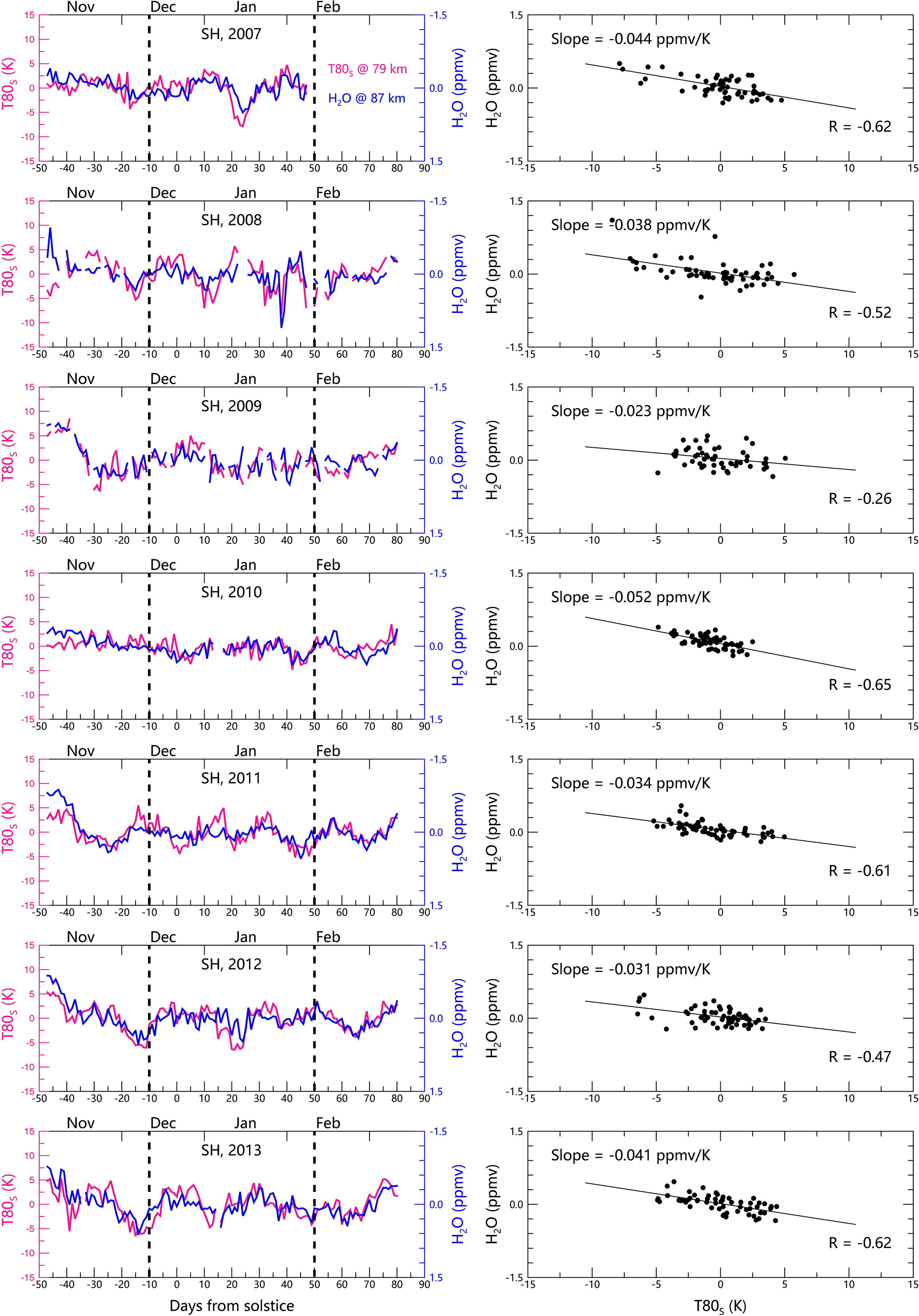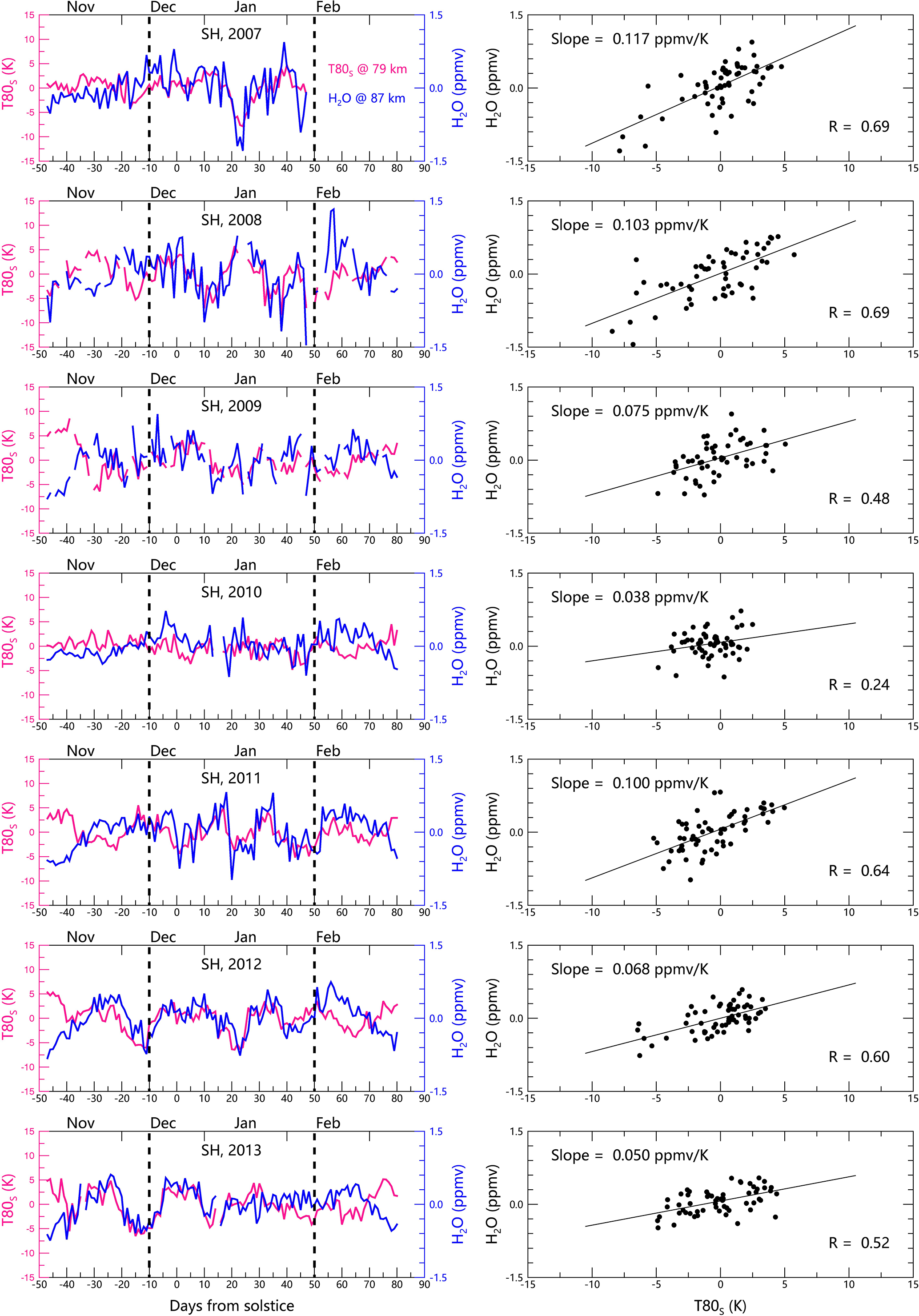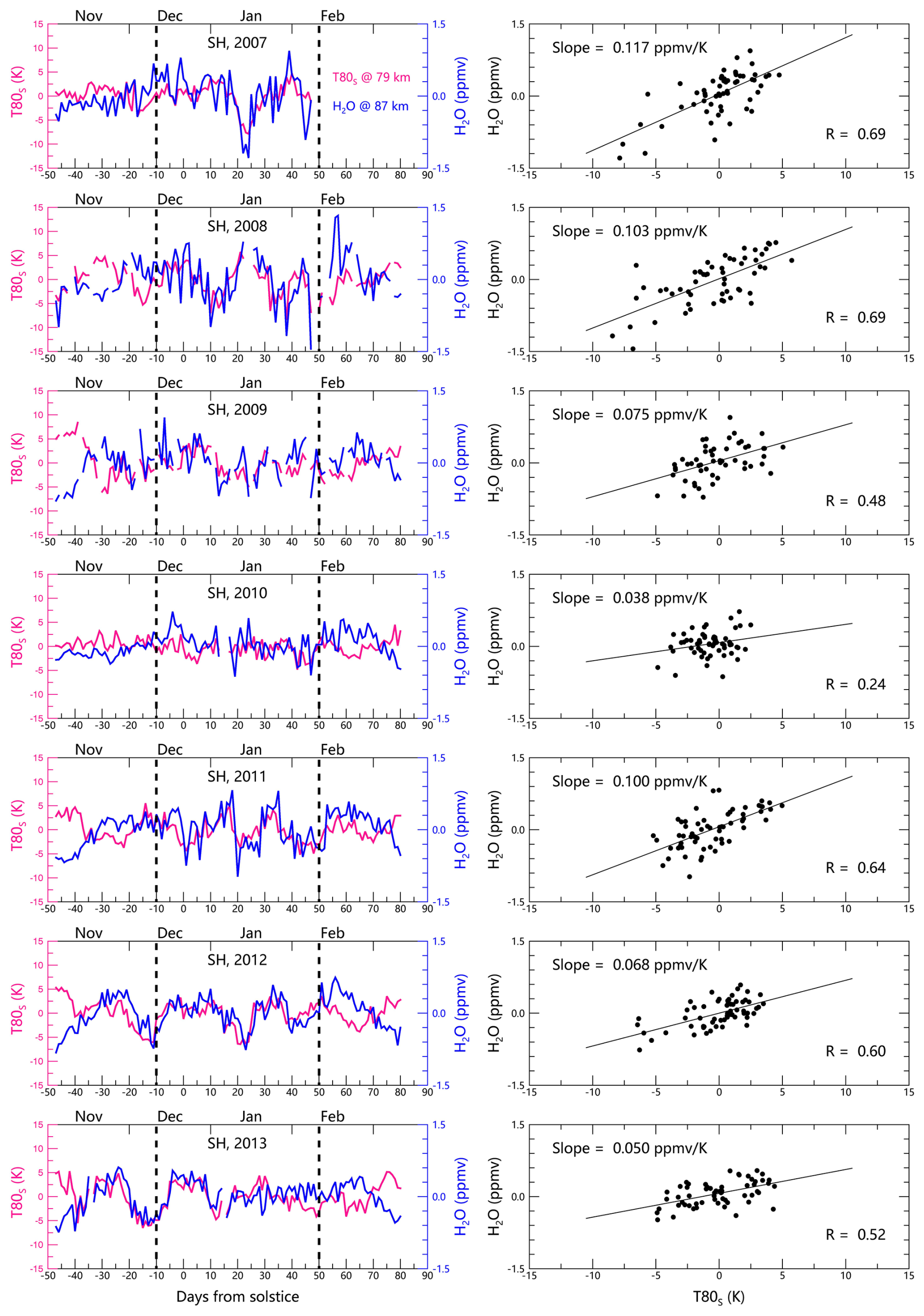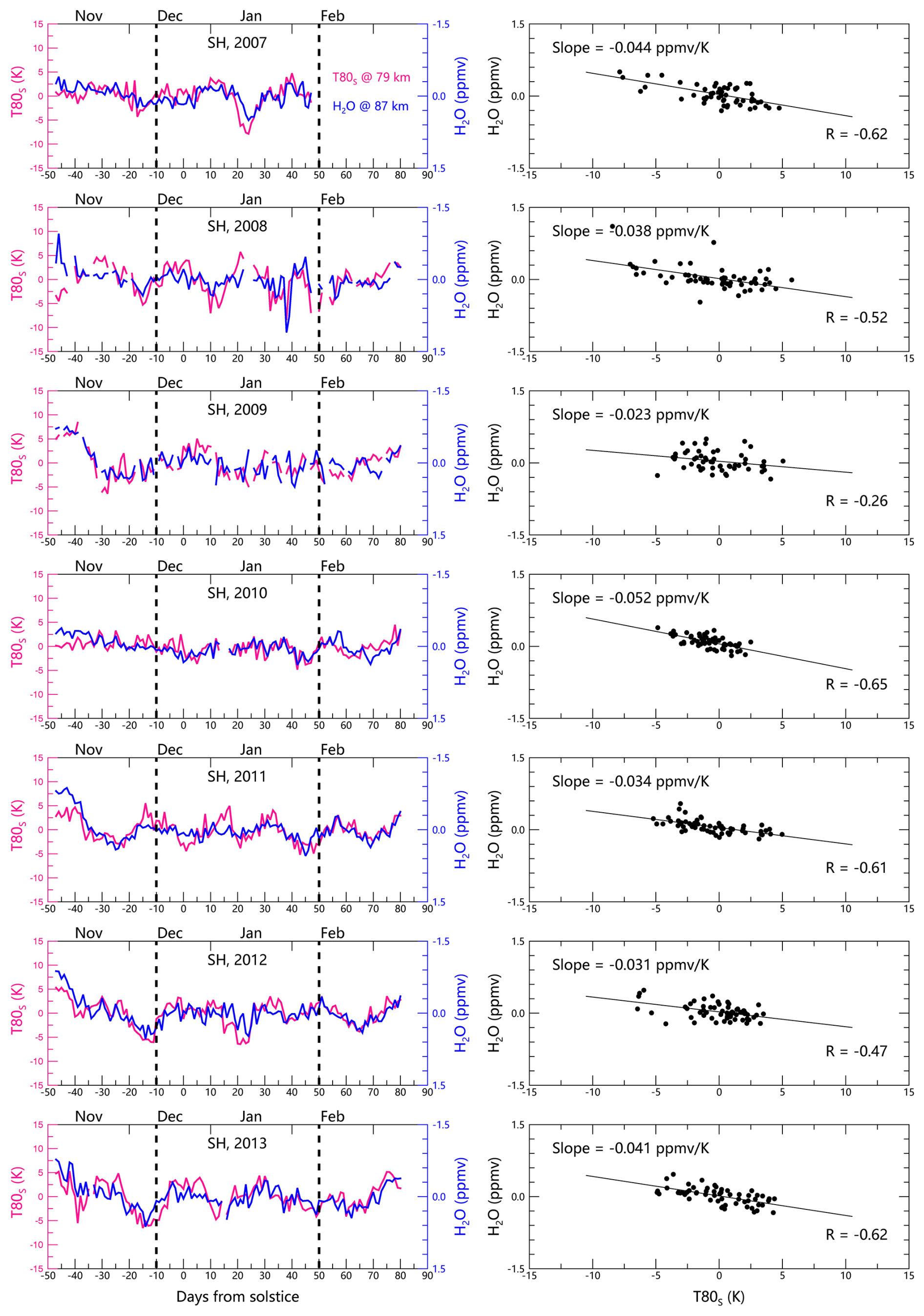 Figure 13Hydration at 80 km driven by upwelling. (Left) Negative correlation between temperatures at 79 km (T80S, proxy for summer polar upwelling) and H2O at 80 km in the SH from 2007/2008 to 2013/2014. (Right) Corresponding correlation coefficients for the core PMC seasons (time span of −10 to +50 d relative to solstice). SOFIE/AIM data at ∼ 70° S with 35 d running mean removed. Notably, the negative correlations in left panels persist even outside core PMC seasons, demonstrating that hydration is fundamentally driven by upwelling rather than PMCs.