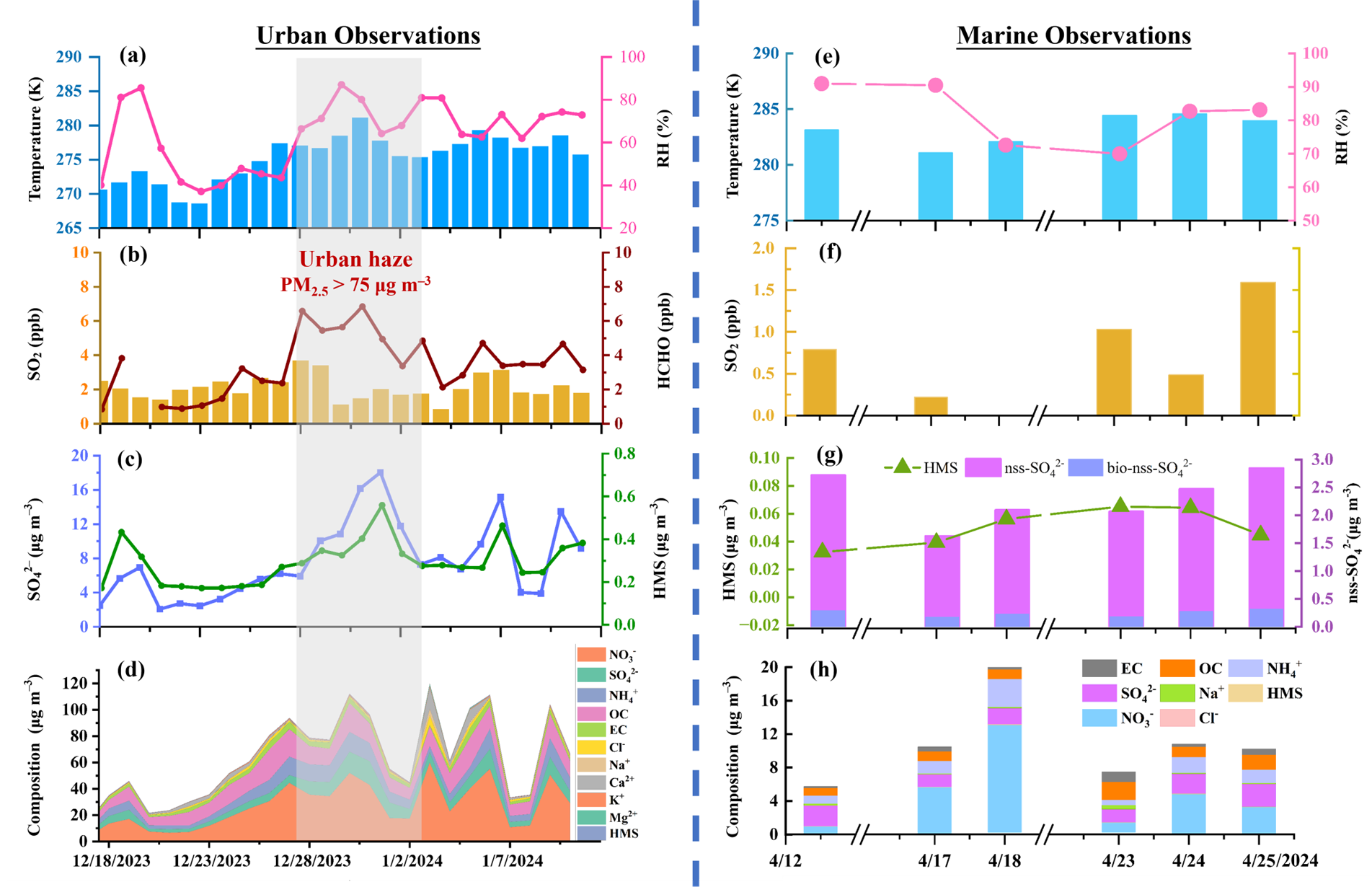 Figure 1(a–d) Urban observations: time series of atmospheric measurements in urban Nanjing of (a) temperature and relative humidity; (b) SO2 and HCHO levels; (c) HMS and sulfate concentration; (d) PM2.5 composition. The gray shaded area highlighted a 7 d haze episode (27 December 2023 to 2 January 2024) with PM2.5 mass concentration exceeding 75 µg m−3. Other ancillary measurements in urban atmosphere, including wind speed and wind direction, PM2.5 mass concentration, O3, NH3 level, fog occurrence, and cloud water content, can be found in Fig. S2 in the Supplement. (e–h) Marine observations: atmospheric measurements during marine cruise of (e) temperature and relative humidity; (f) SO2; (g) HMS and sulfate level, where the biogenic nss-sulfate (bio-nss-sulfate) was calculated based on a previously measured bio-nss-sulfate/nss-sulfate ratio of 0.14 (Yang et al., 2015); (h) PM2.5 composition.
