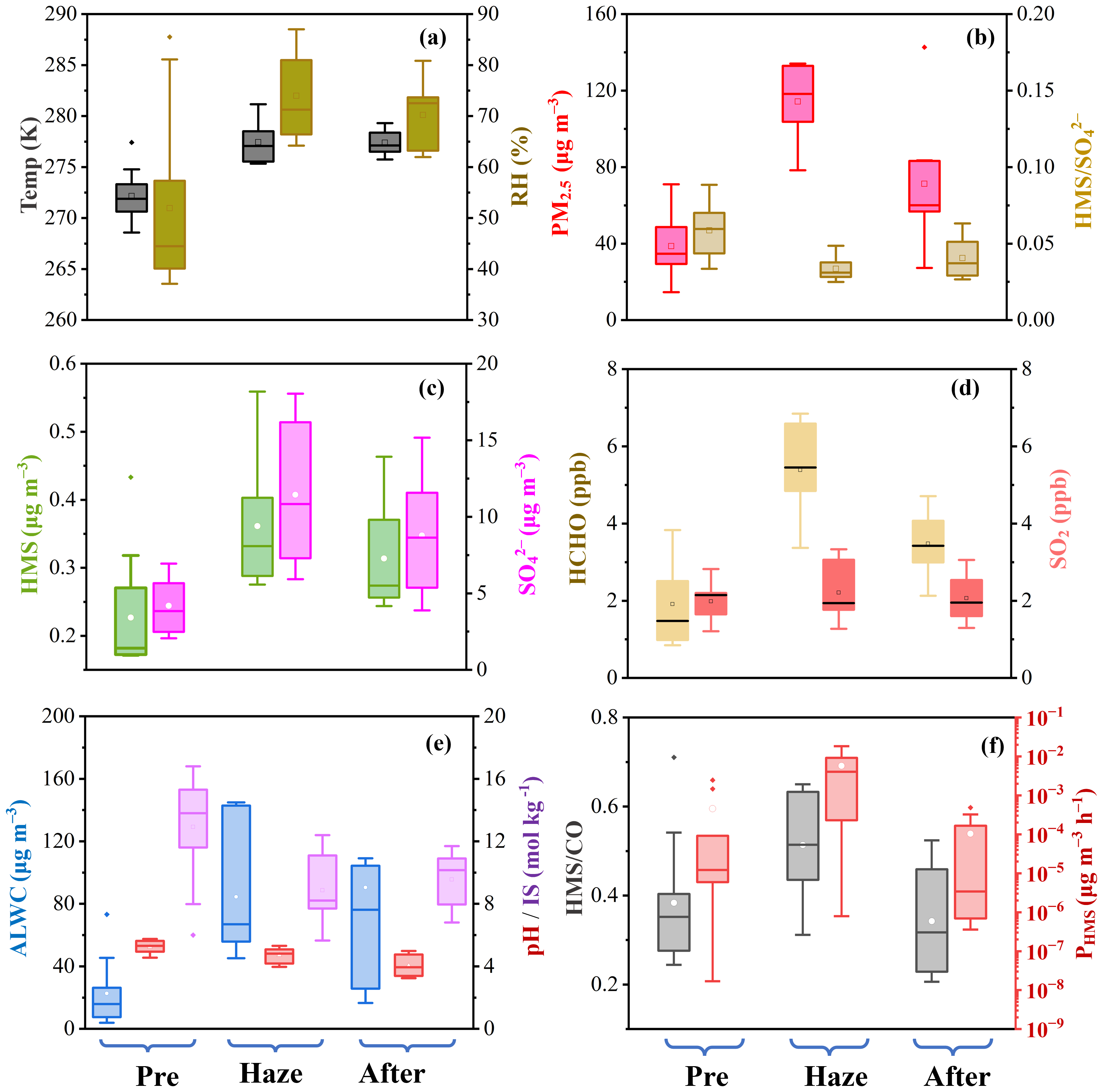 Figure 2Averaged atmospheric characteristics under different pollution scenarios in urban Nanjing (i.e., pre-haze, haze, and after): (a) temperature and RH; (b) PM2.5 and molar ratio; (c) HMS and sulfate concentration; (d) gas precursor levels; (e) aerosol properties, such as liquid water content (ALWC), pH, and ionic strength (IS); (f) comparison between ratio and HMS formation rates (PHMS). Detailed values pertaining to these parameters are provided in Table S1.