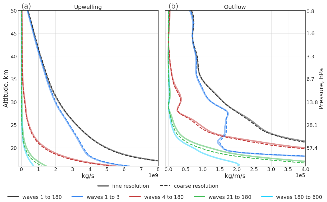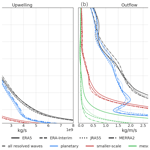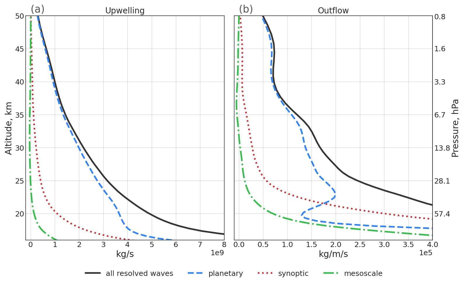 Figure 3(a) Vertical profiles of mean (1980-2017) upwelling estimated with DWCP and driven by all resolved wave drag (black solid line), planetary wave drag (blue dashed line), synoptic-scale wave drag (red dotted line), and mesoscale wave drag (green dash-dotted line). (b) Equivalent to panel (a) with vertical profiles of mean outflow. The figure is based on ERA5 data.