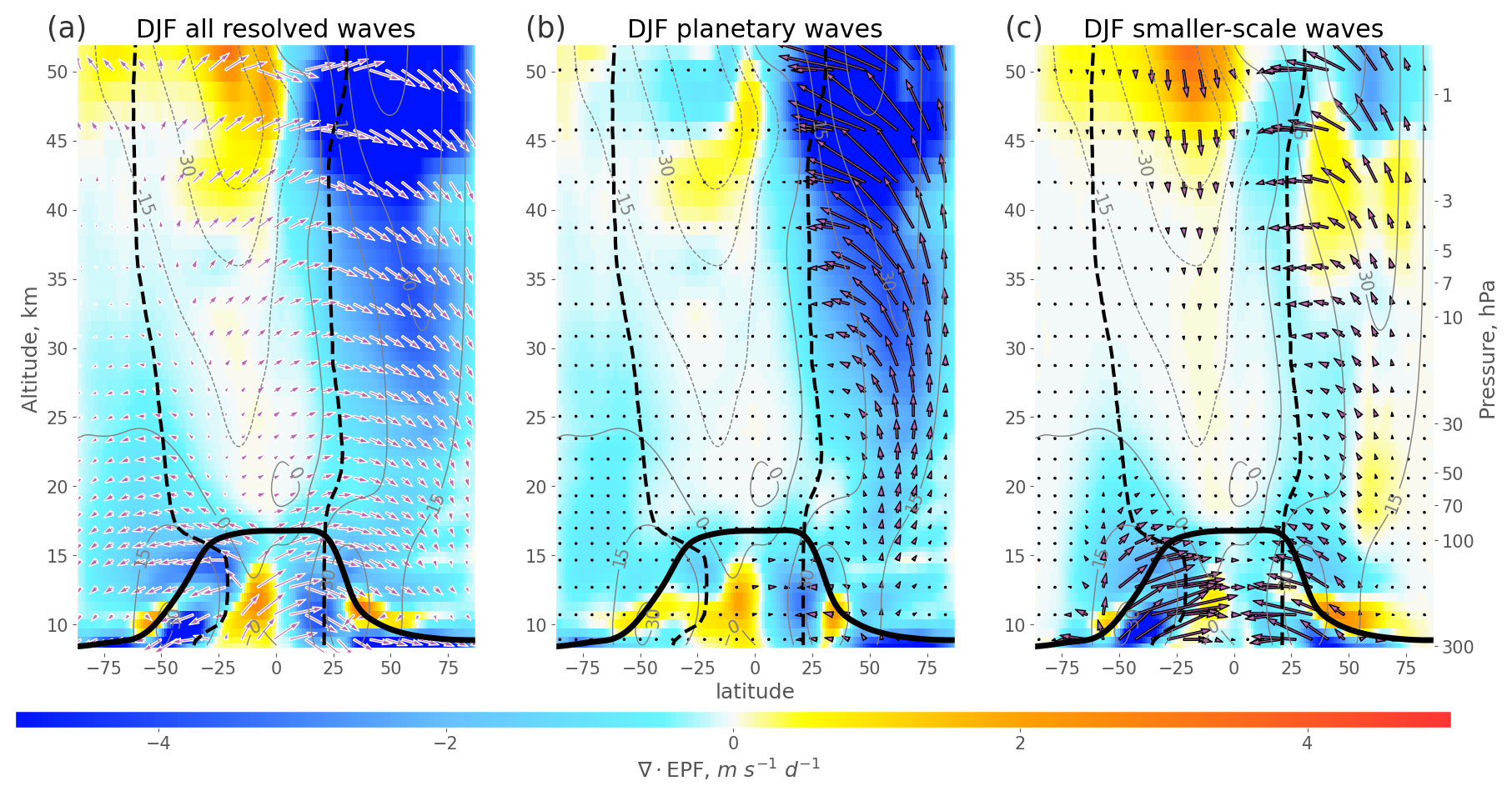 Figure 1Climatological (1980–2017) distributions of resolved wave drag (estimated as ∇⋅F, colour-coded) together with Eliassen–Palm flux vectors (black contour arrows in panels b and c), log scaled TEM residual circulation (white contour arrows in panel a), zonal mean zonal wind (grey contours) from ERA5 reanalysis for December–February. The distributions are shown for the contribution from all resolved waves (left), from planetary waves (wavenumbers 1–3, middle) and from smaller-scale waves (wavenumber higher than 3, right). The black dashed lines show the turn-around latitudes (where upwelling in tropics changes to downwelling in extratropics), the thick black line shows the tropopause.