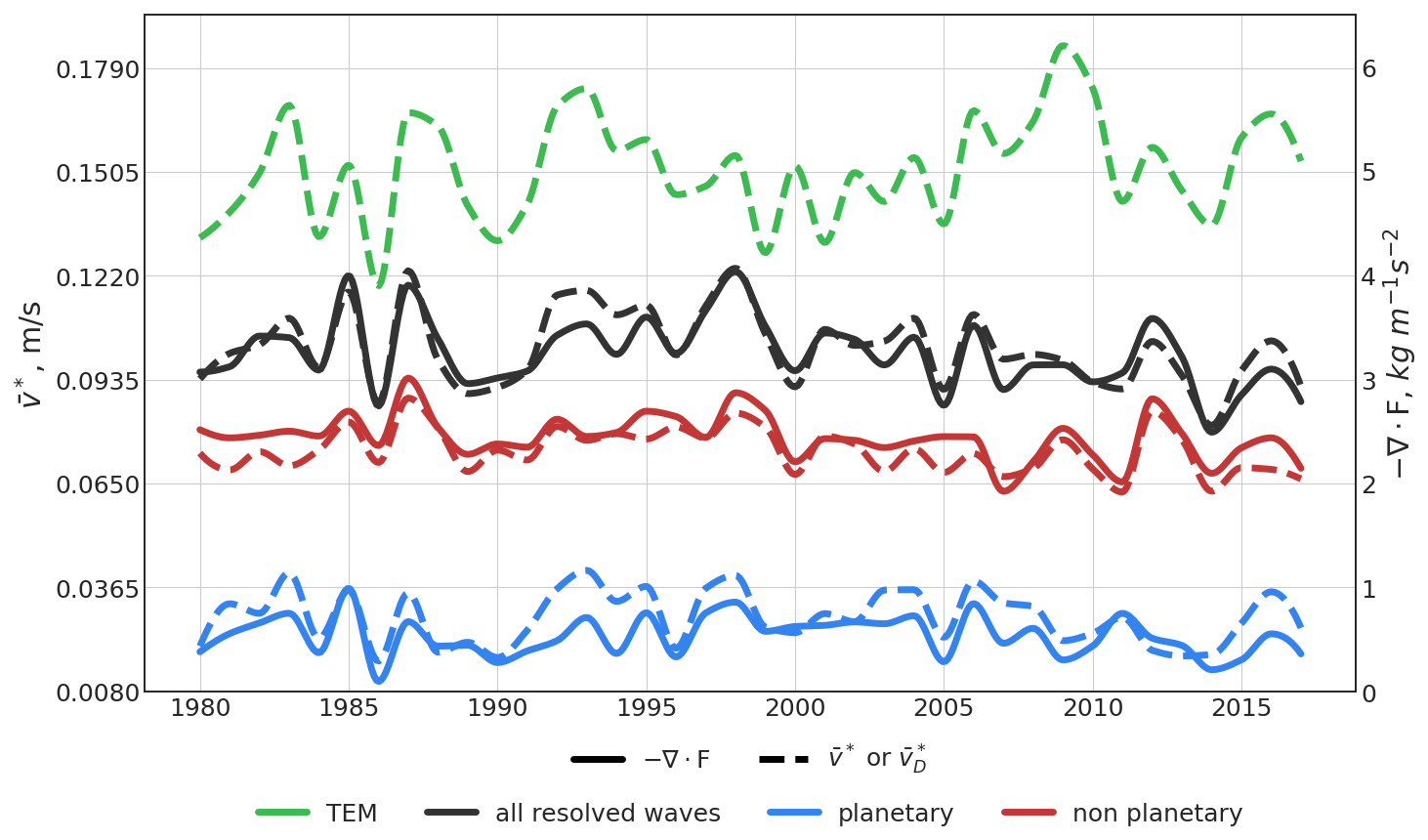 Figure 2 Annual mean time series at 70 hPa (mean 20–40° N) of horizontal component of the residual circulation (dashed lines), and ∇⋅F flux (solid lines). Residual velocity from TEM approach (green), ∇⋅F and residual velocities from DWCP for total (black), planetary (blue) and other than planetary (red) waves. The figure is based on 1980–2017 ERA5 data.