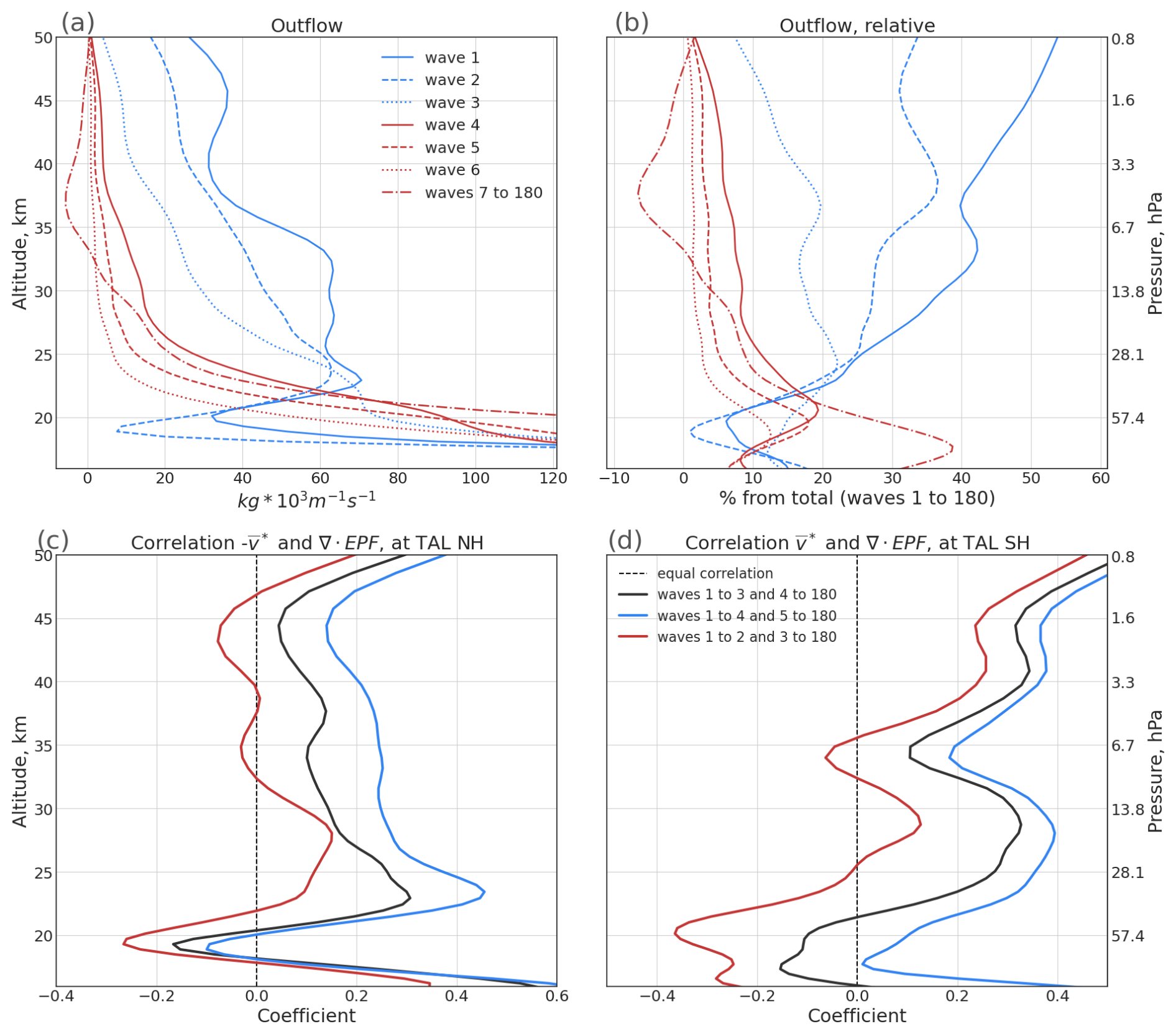 Figure 4 (a) Tropical outflow from the area between TAL into the extratropics calculated from the downward control principle for different waves (colours and line styles). (b) Equivalent to panel (a) but in relative units as percentage of the total outflow of all resolved waves. (c) Difference between the correlations of outflow velocity from the TEM approach with wave drag generated by large-scale and smaller-scale waves (computed as the correlation with large-scale waves minus the correlation with smaller-scale waves), evaluated at turn-around latitudes in the Northern Hemisphere. Colours represent different wave bands for the large- and smaller-scale wave categories. (d) Same as panel (c) but for the Southern Hemisphere. Deseasonalized monthly mean data are used for calculation of the correlations presented in panels (c) and (d). The lines presented in this figure were smoothed with a Gaussian filter for better readability. The figure is constructed from monthly mean ERA5 data for 1980–2017.