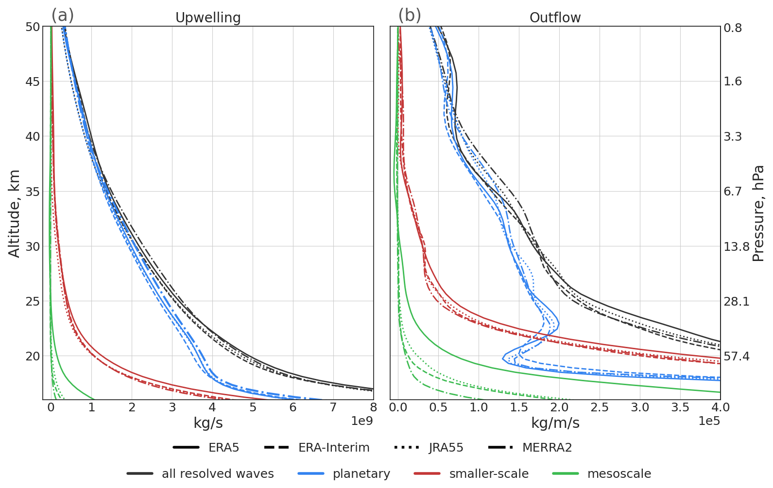 Figure 5 (a) Mean profiles of upwelling calculated from DWCP, induced by all resolved waves (black lines), planetary waves (blue lines), smaller-scale waves including mesoscale (red lines), and mesoscale waves (green lines) from ERA5 (solid), ERA-Interim (dashed), JRA55 (dotted), and MERRA2 (dash-dotted) reanalyses for 1980–2017. (b) Corresponding profiles of outflow. The lines presented in this figure were smoothed with a Gaussian filter for better readability.