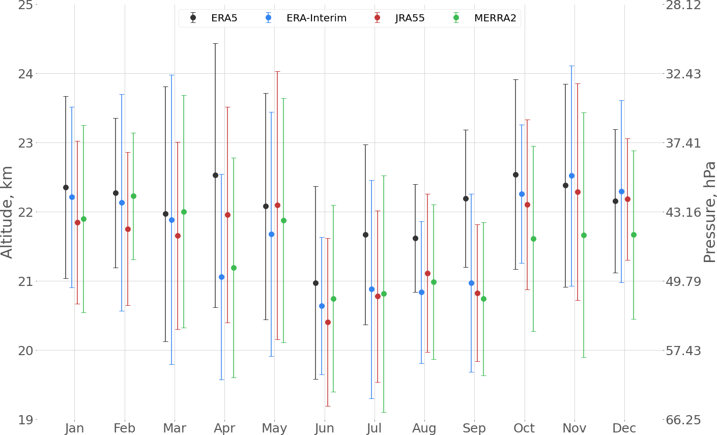 Figure 6 Seasonal cycle of the level separating the deep and shallow branches of the stratospheric circulation. Dots show the mean altitude of the level for each month, with the corresponding standard deviation as error bar. The colours represent different reanalyses: ERA5 (black), Era-Interim (blue), JRA55 (red), and MERRA2 (green). The level is estimated from 1980–2017 monthly mean data.