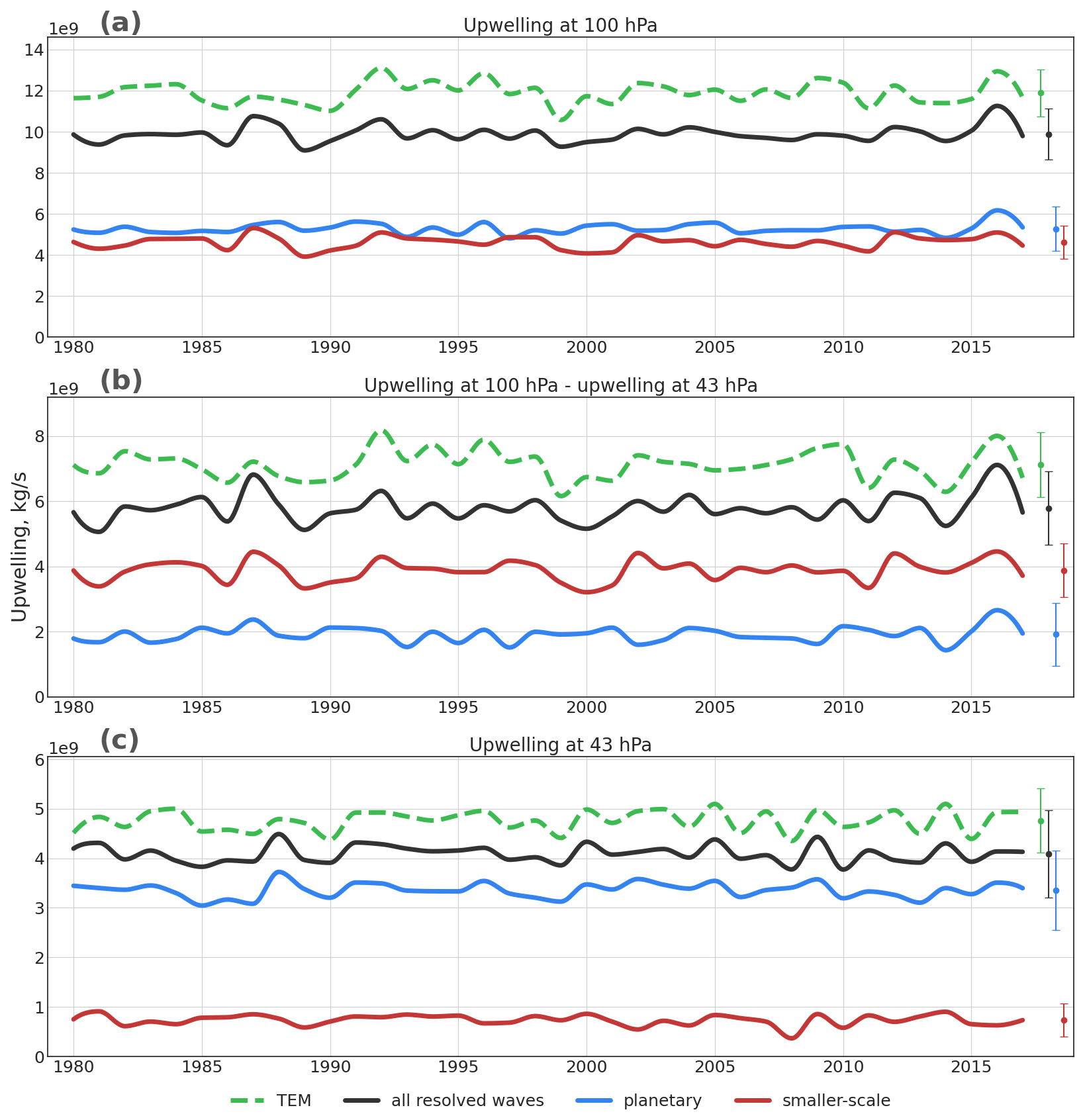 Figure 7 (a) Annual mean time series (1980–2017) of upwelling at 100 hPa based on ERA5 data. Shown are estimates from the TEM approach (green), total resolved wave drag (black), planetary wave drag (blue), and smaller-scale wave drag (red). Dots indicate mean values over the entire period, and error bars represent the standard deviation of monthly mean values, consistent with Table 1. (b) Difference in upwelling between 100 and 43 hPa, using the same colour scheme as in panel (a). (c) Upwelling at 43 hPa, again using the same legend as in panel (a).