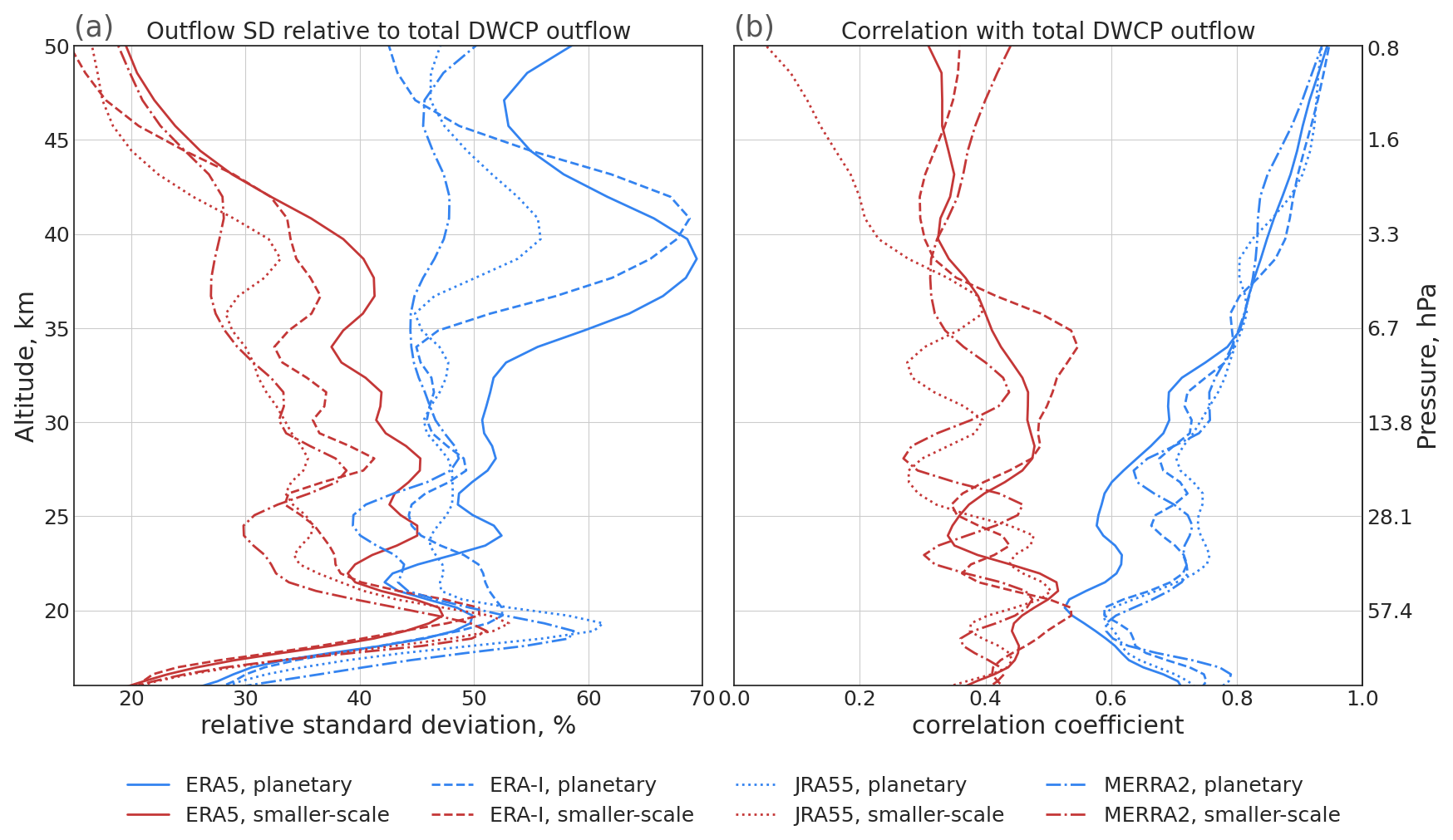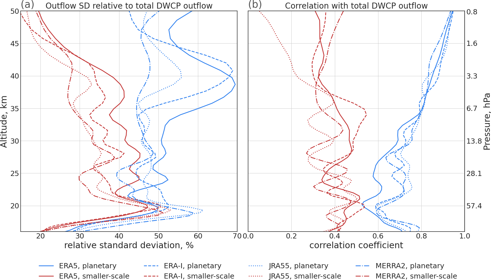 Figure 8 (a) Vertical profiles of tropical outflow variability, quantified by the standard deviation of DWCP outflow (blue lines driven by planetary wave drag, red lines by smaller-scale wave drag) relative to DWCP outflow driven by total resolved wave drag. (b) Vertical profiles of correlation coefficients between DWCP outflow driven by all waves and the outflow driven by only planetary (blue) and smaller-scale waves (red). Profiles have been constructed from 1980–2017 deseasonalized monthly mean data. The lines were smoothed with a Gaussian filter for better readability.