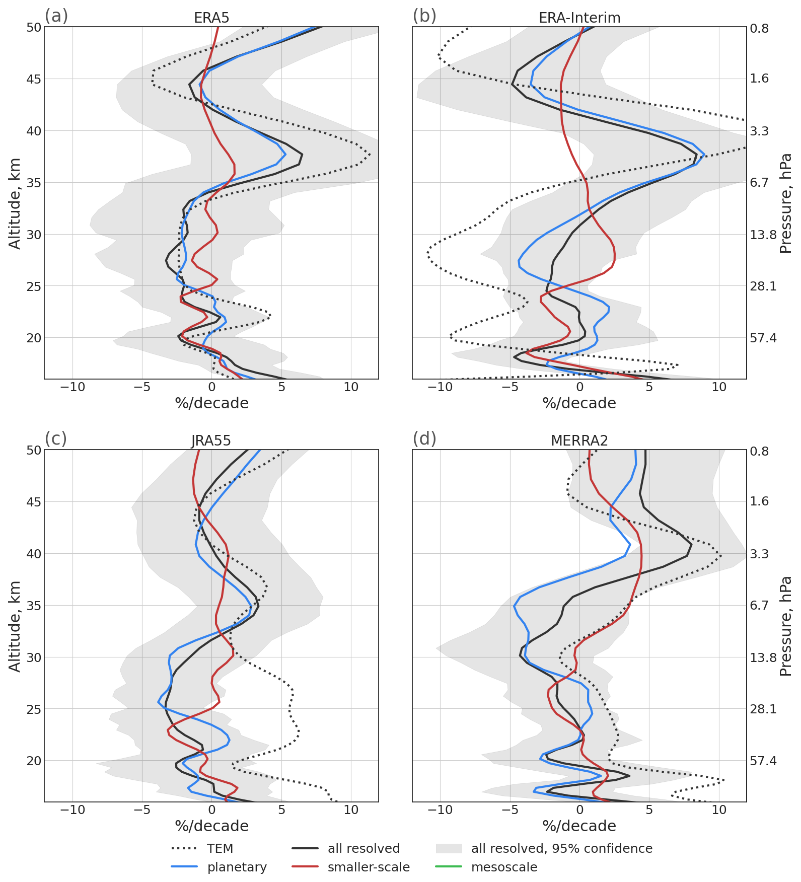 Figure 9 Vertical profiles of upwelling trend derived using TEM (dotted black line) or DWCP from total (black), planetary (blue), smaller-scale (red), and mesoscale (green) waves, gray shading denotes 95 percent confidence interval for total waves. The profiles were constructed from annual mean data for ERA5 (a), ERA-Interim (b), JRA55 (c), and MERRA2 (d). The lines were smoothed with a Gaussian filter.