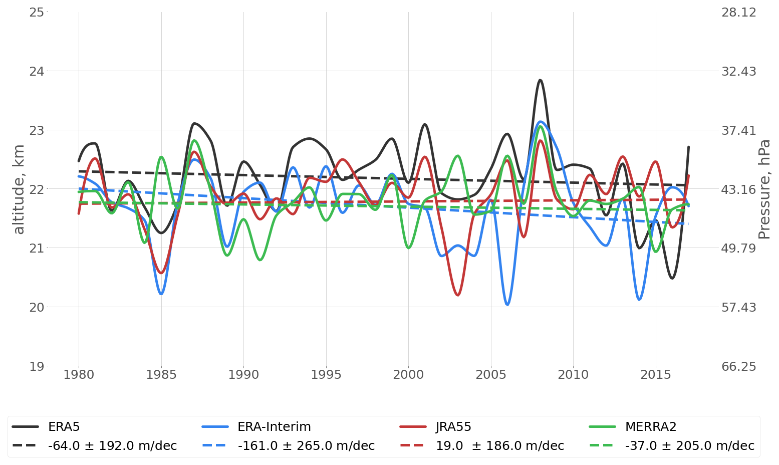 Figure 11 The variability and trend of the separation level between shallow and deep stratospheric circulation branches over the period 1980–2017 from ERA5 (black), ERA-Interim (blue), JRA55 (red), and MERRA2 (green). Solid lines represent the annual mean separation level and dashed lines show the linear trend based on the annual mean level. Decadal trend values ±2 standard error are given in the legend.