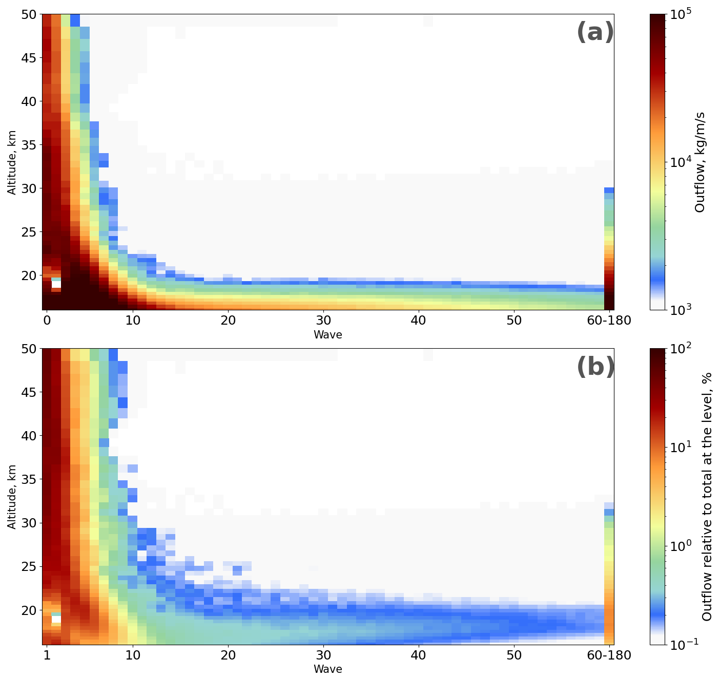 Figure A1 (a) The 1980–2017 mean vertical profiles of DWCP outflow estimated for different waves from ∇⋅F calculations based on ERA5 data. (b) As in panel (a) but showing the relative contribution (%) of each wave component to the total DWCP outflow at each vertical level.