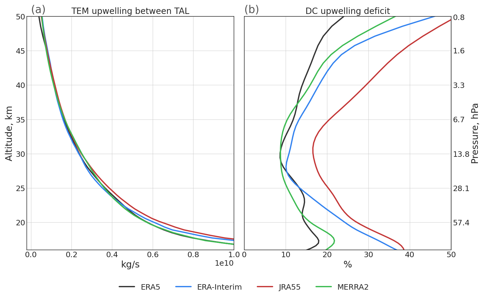 Figure A2 (a) 1980–2017 mean profiles of TEM upwelling from ERA5 (black), ERA-Interim (blue), JRA55 (red), and MERRA2 (green) reanalyses. (b) The mean upwelling deficit in the downward control calculation (in percent), estimated as the relative difference between TEM and downward control upwelling. This upwelling deficit corresponds to the missing wave drag in the downward calculation (see the text). The deficit lines were smoothed with a Gaussian filter. The black line for ERA5 upwelling in panel (a) in the lower stratosphere mostly overlaps with the green MERRA2 line.
