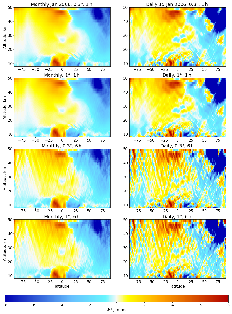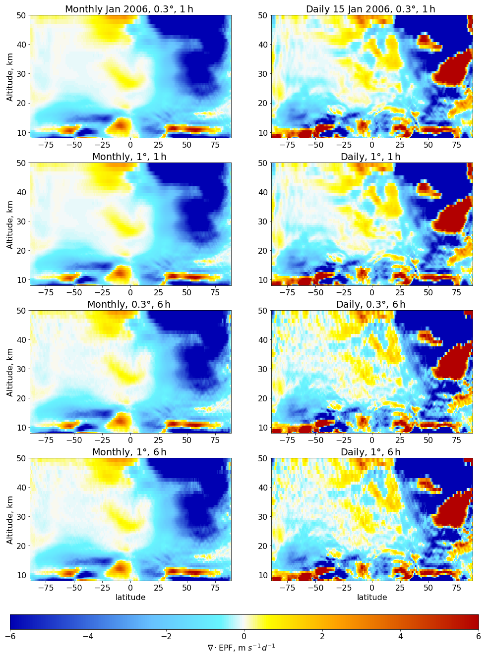 Overall, the down-sampling to coarser spatial resolution did not significantly affect the large-scale features of the residual circulation considered here (see Figs. A4 and A5). As also shown by Seviour et al. (2011), from a climatological monthly-mean perspective, the 6 h data are sufficient to take tidal effects into account. Furthermore, for 6 h temporal resolution some distortions remain in monthly mean data for (Fig. A5), while only little to no distortions remain for ∇⋅F (Fig. A4). Regarding daily mean data for specific dates, reducing the temporal resolution from 1 to 6 h has a significant impact on the representation of the residual circulation. Therefore, in order to investigate short-term and smaller-scale features of the circulation it seems important to use higher temporal resolution than 6 h. Nevertheless, the overall characteristics of the circulation on the monthly timescale are affected by the down-sampling only to a limited and acceptable extent.