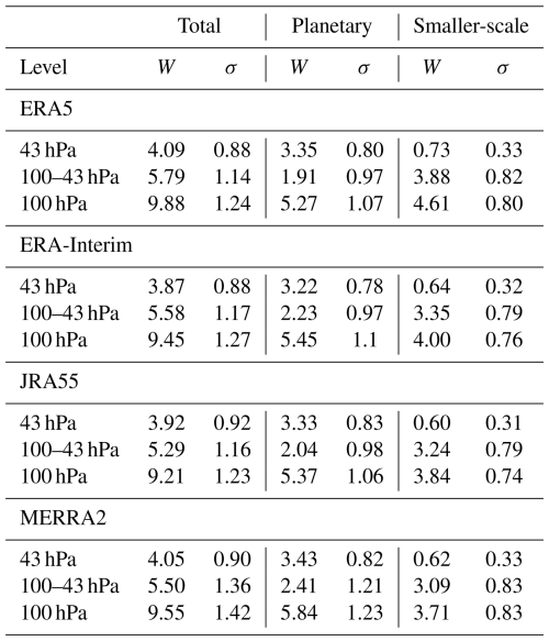Figure 7 shows the upwelling at 100 hPa which is close to the tropopause, at 43 hPa which is approximately the separation level between shallow and deep branch, and the difference between upwelling at 100 and 43 hPa. The upwelling at the tropopause represents the total mass flux into the stratosphere within the BDC and is related to the outflow at all levels above in the stratosphere (with a small portion of it even related to outflow at levels above the stratopause). Therefore, changes in upwelling at this level reflect changes in the overall overturning circulation. The annual mean upwelling at 100 hPa, generated by all resolved waves and estimated using the DWCP, is approximately 9.9×109 kg s−1 in ERA5. In comparison, MERRA2 and ERA-Interim exhibit slightly weaker upwelling rates of about 9.5×109 kg s−1, while JRA55 shows the weakest upwelling at this level, of about 9.2×109 kg s−1. The upwelling variability at this level is substantial, with the standard deviations estimated from deseasonalized monthly mean upwelling ranging from 1.2×109 to 1.4×109 kg s−1 across the reanalyses (Table 1). At 100 hPa, the planetary waves and resolved smaller-scale waves contribute comparably to the annual mean upwelling, with approximately 53 % attributed to planetary waves and 47 % to smaller-scale waves. In contrast, the other reanalyses exhibit a slightly greater contribution from planetary waves ranging from 58 % for ERA-Interim to 61 % for MERRA2. The upwelling at 100 hPa caused by planetary wave drag has a standard deviation comparable to that caused by smaller-scale waves (Table 1). Therefore, both planetary and smaller-scale waves contribute comparably to the forcing and variability of the whole overturning circulation.