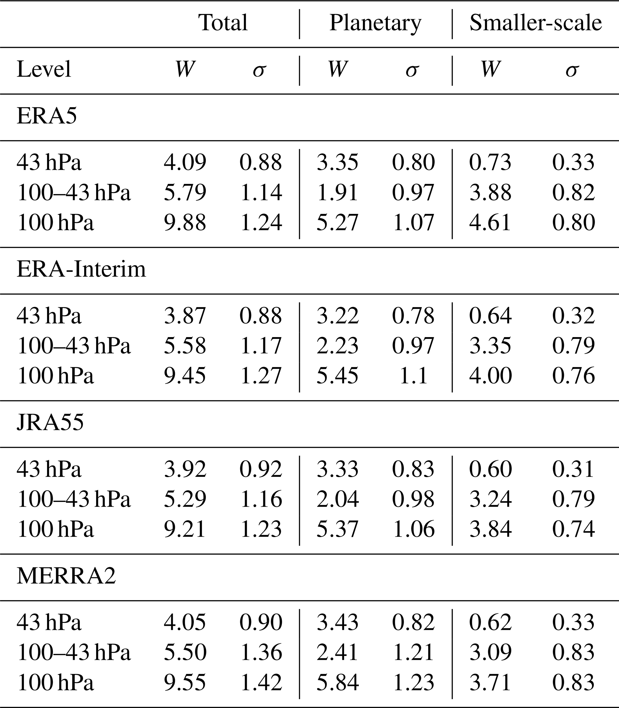 The upwelling across the mean separation level is a result of the wave drag in the deep branch region above that level. The annual mean of this upwelling across the separation level is ranging from 3.9×109 to 4.1×109 kg s−1 depending on the reanalysis, the majority of which is caused by planetary waves and less than 20 % by smaller-scale waves. The variability of the monthly mean upwelling across the separation level (43 hPa) is mostly controlled by planetary waves (see Fig. 7). This is indicated by the fact that variability (here measured in terms of standard deviation) of upwelling induced by planetary waves is more than 2 times larger compared to the variability of upwelling induced by smaller-scale waves (Table 1). Therefore, despite the clear separation in wave driving concerning the climatological mean circulation, both wave types contribute significantly to the circulation variability of the shallow branch, while the variability of the deep branch is mostly controlled by the planetary waves.