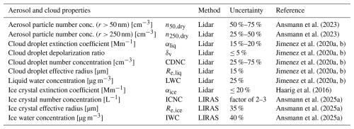 Table 1Aerosol and cloud products, obtained from lidar-only analysis (Lidar) or from the synergy of lidar and radar observations (LIRAS: lidar-radar synergy). r denotes the radius of the dry aerosol particles. Typical relative uncertainties in the retrieval products are given. The referenced articles provide detailed information about the retrievals and further literature.