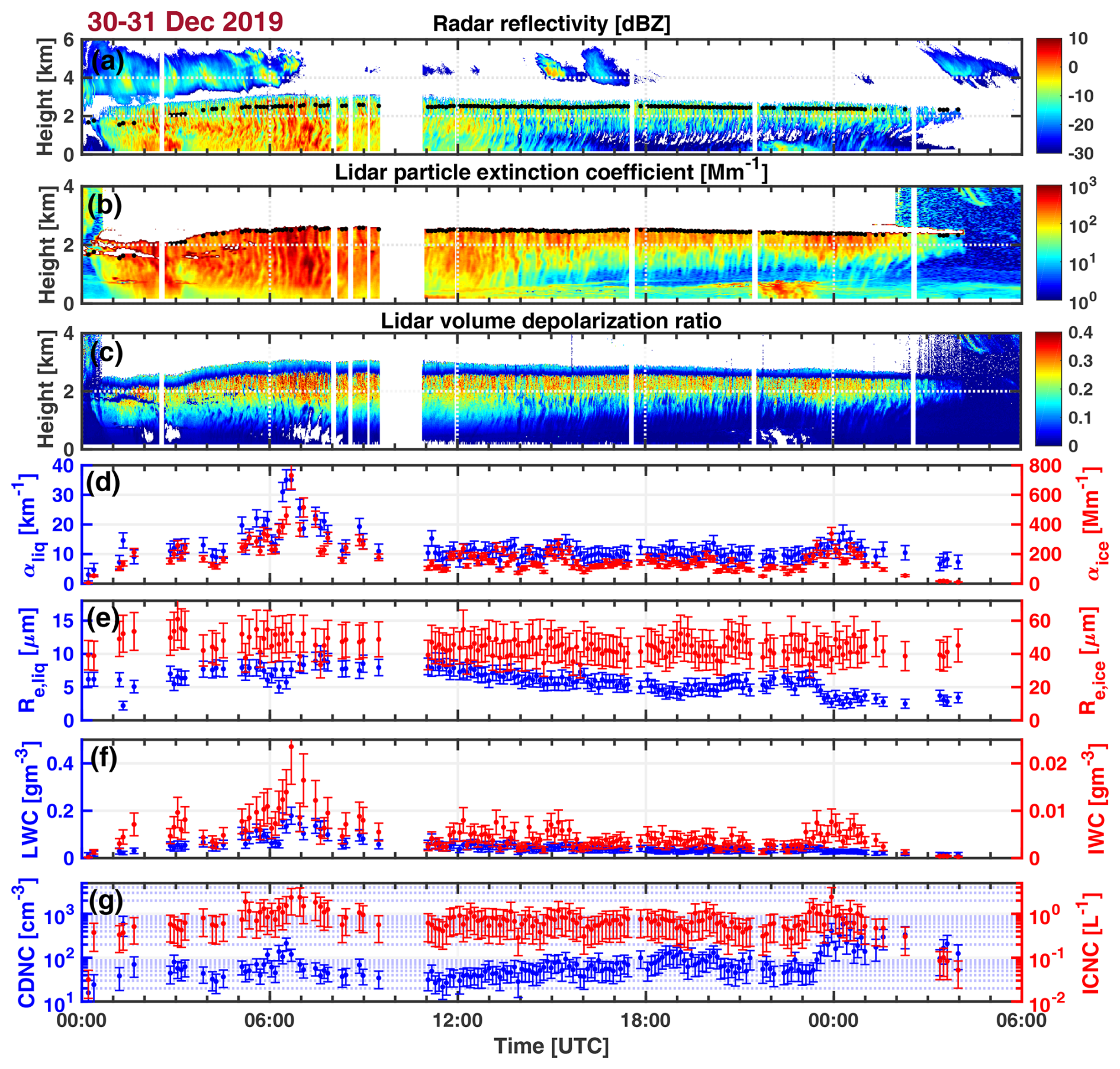 Figure 4Temporal evolution of the winter MPC as observed (a) with cloud radar (radar reflectivity Z) and (b, c) with lidar ((b) particle extinction coefficient αice, (c) volume depolarization ratio δv) on board Polarstern at 86.6° N on 30–31 December 2019. Black dots in panels (a) and (b) show the base of the liquid-bearing cloud layer as detected with lidar. Time series of (d) the droplet extinction coefficient (in blue) and the ice crystal extinction coefficient (in red), (e) the effective radii of droplets (blue) and ice crystals (red), (f) LWC (blue) and IWC (red), and (g) CDNC (blue) and ICNC (red) are retrieved by using the basic observations in panels (a), (b), and (c). The droplet properties (in blue) are computed for the height of 75 m above the base of the liquid-dominated cloud top layer. The ice properties (in red) are determined in the virga zone around 250 m below the base of the liquid-dominated cloud layer. SD bars indicate the uncertainty in the retrieval products. Gaps in the time series, associated with the white vertical columns in panels (a) to (c), indicate missing data.
