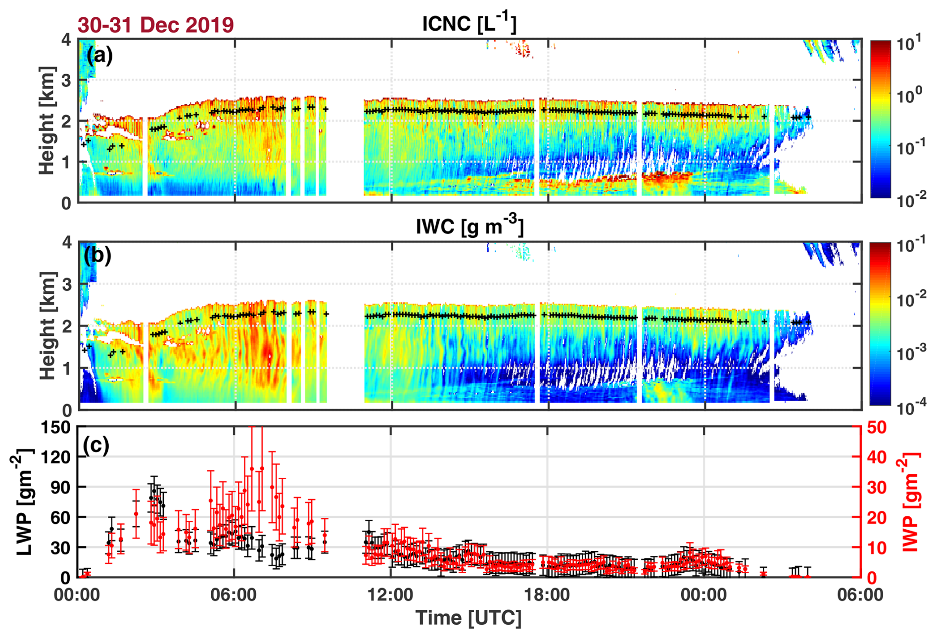 Figure 5Evolution of the MPC observed on 30–31 December 2019 in terms of (a) the ice crystal number concentration (ICNC), (b) the ice water content (IWC), and (c) the liquid water path LWP (blue) and ice water path IWP (red). Error bars show the uncertainty in the retrieved LWP and IWP values. White vertical columns indicate periods without lidar data. The uppermost red rim of the data field in panel (a) is a bias and occurs at the base (sharp edge) of the liquid-dominated cloud layer. The black crosses indicate the height of 250 m below cloud base for which the time series of the ice-phase microphysical properties in Fig. 4 are shown.