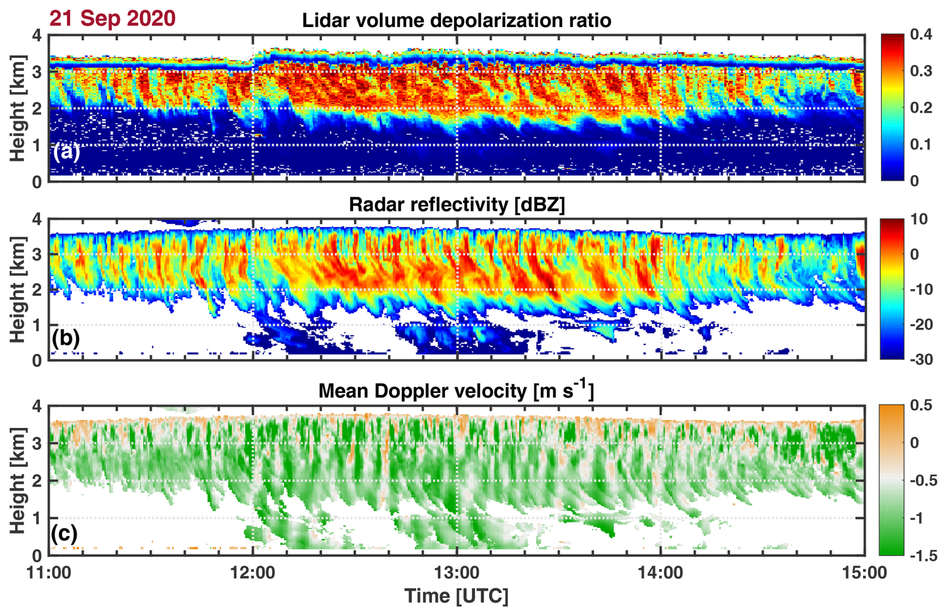Figure 6Perturbations of the MPC development on 21 September 2020 at 12:00 UTC, visible in the lidar observations of the volume depolarization ratio in panel (a) at heights of 3–3.5 km. In panel (b), the cloud radar reflectivity Z is shown, and in panel (c), the mean Doppler velocity derived from the Doppler radar observations is presented. The gray to orange colors in panel (c) may indicate upwind areas when taking an average ice crystal sedimentation speed of 50 cm s−1 into account.