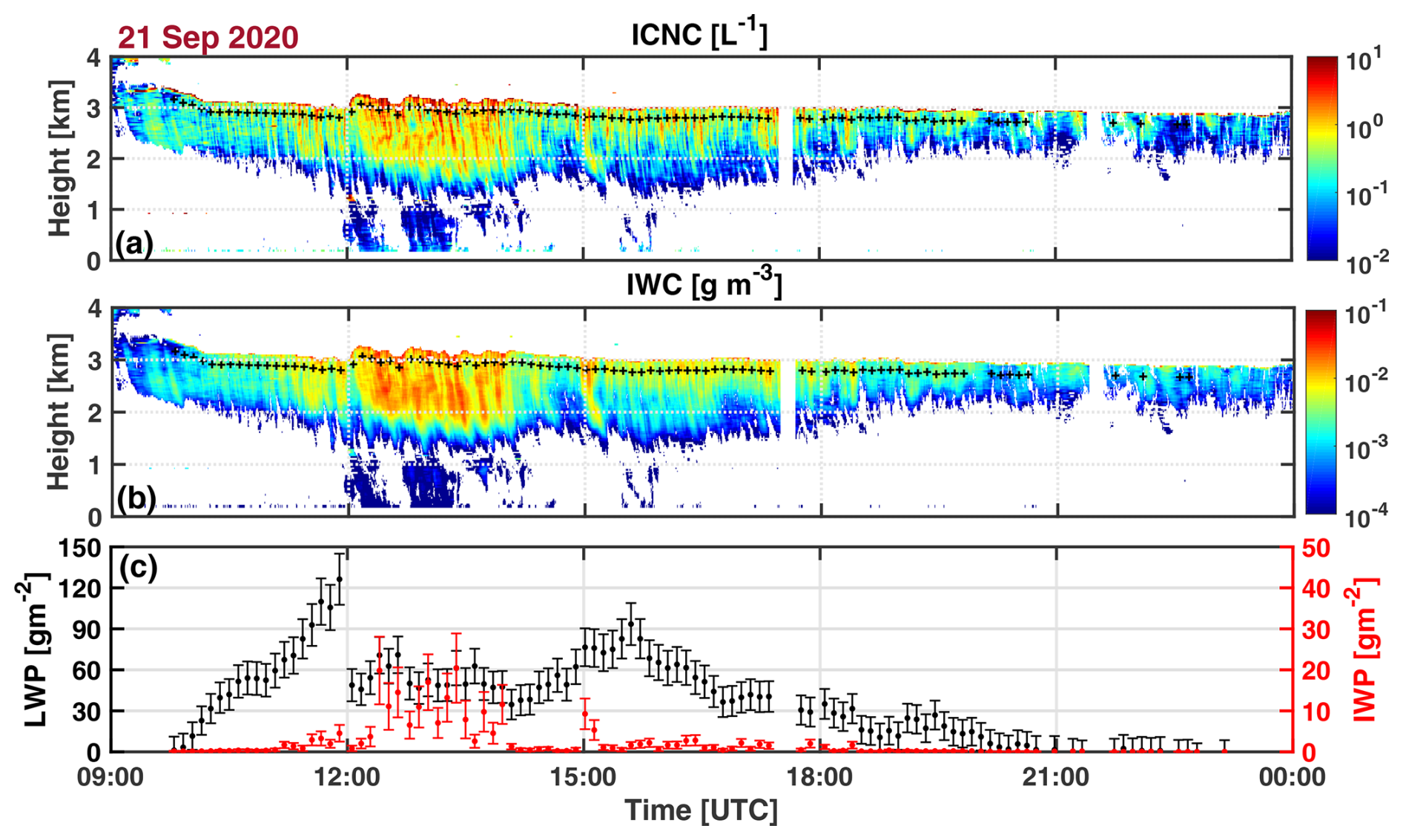 In this section, we discuss the temporal evolution of a long-lasting late-summer MPC event that was observed near the North Pole on 21 September 2020. Polarstern was drifting within an ice field at 88.5° N. The results for this case are given in Figs. 68. Similar to the air mass transport on 29–31 December 2020, the free tropospheric air mass, in which the MPC developed, crossed areas mainly north of 60° N (Northern Canada, Iceland region) during the last 10 d before arriving over Polarstern. In contrast to the December 2019 case study, the cloud top temperatures were around −22.5 to −23.5 °C (at 3.3–3.4 km height) according to the radiosondes launched at 11:00 and 17:00 UTC on 21 September 2020. The cloud layer was thus warmer by 8–10 K than the one in December 2019. A drop by 2 K at 3.3 km height from 05:00 UTC (cloudless conditions) to 11:00 UTC was observed due to radiative cooling of the liquid-dominated cloud top region. Anthropogenic pollution and wildfire smoke from Siberia and North America had advected into the central Arctic since mid-July 2020 (Boyer et al.2023; Heutte et al.2025; Ansmann et al.2023). It is reasonable to assume that, in addition, soil dust and mineral dust, probably predominantly from nordic sources (e.g., from Iceland), and biological aerosol particles (locally produced or advected from the surrounding continents) contributed to the Arctic aerosol mixture. The observed CDNC values of > 100 cm−3 reflect the polluted conditions.