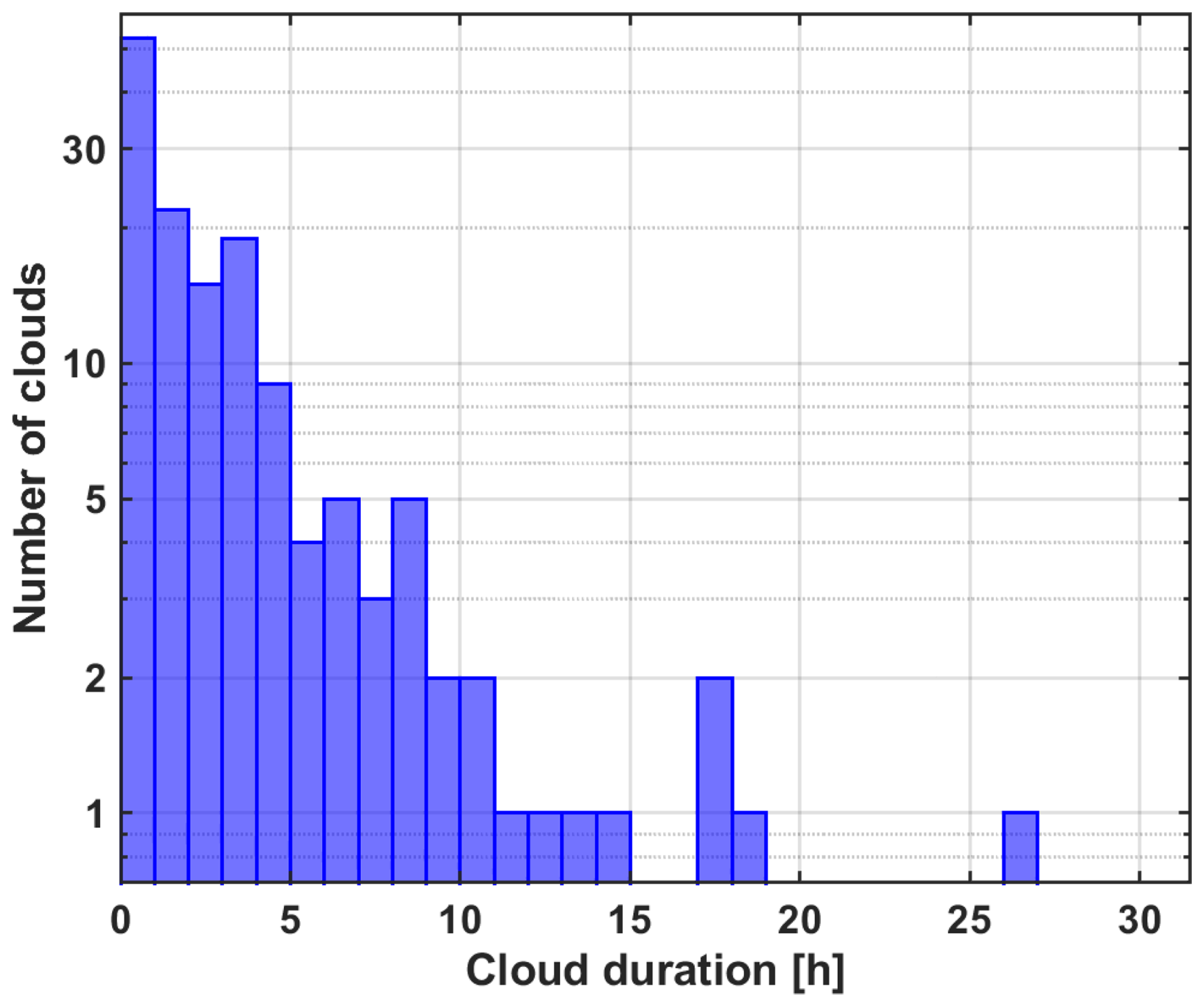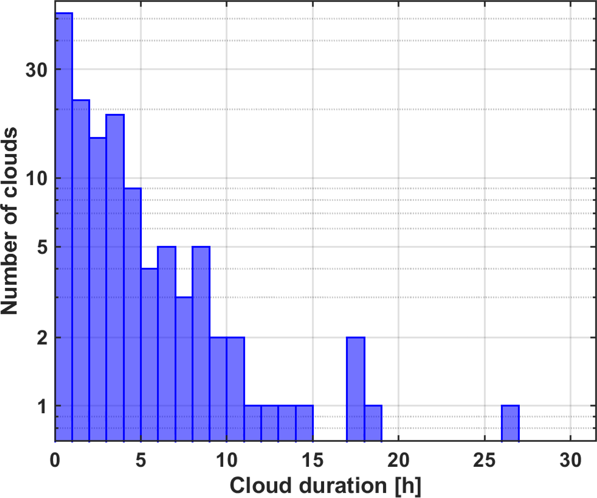 We also show statistics regarding the temporal length of the measured cloud fields. The temporal length is given by the time an individual cloud layer needs to cross the lidar site. We defined cloud layers as single, individual layers when they were detected at different heights. In the case of broken cloud fields (many cloud segments at the same height level), we counted a cloud field as one single cloud system if the detected cloud-free periods lasted for less than an hour. Shupe et al. (2006) counted individual cloud layers in the same way, i.e., cloud layers with gaps of < 1 h in duration were considered to be continuous. If a cloud-free period between subsequent cloud fields exceeded 60 min, the next cloud field, crossing Polarstern at that height level, was counted as a new cloud. We assume in this specific cloud length statistics that all cloud segments, separated even by 30–60 min, still developed at the same meteorological and aerosol conditions and, thus, should not be counted as individual, independent cloud layers.