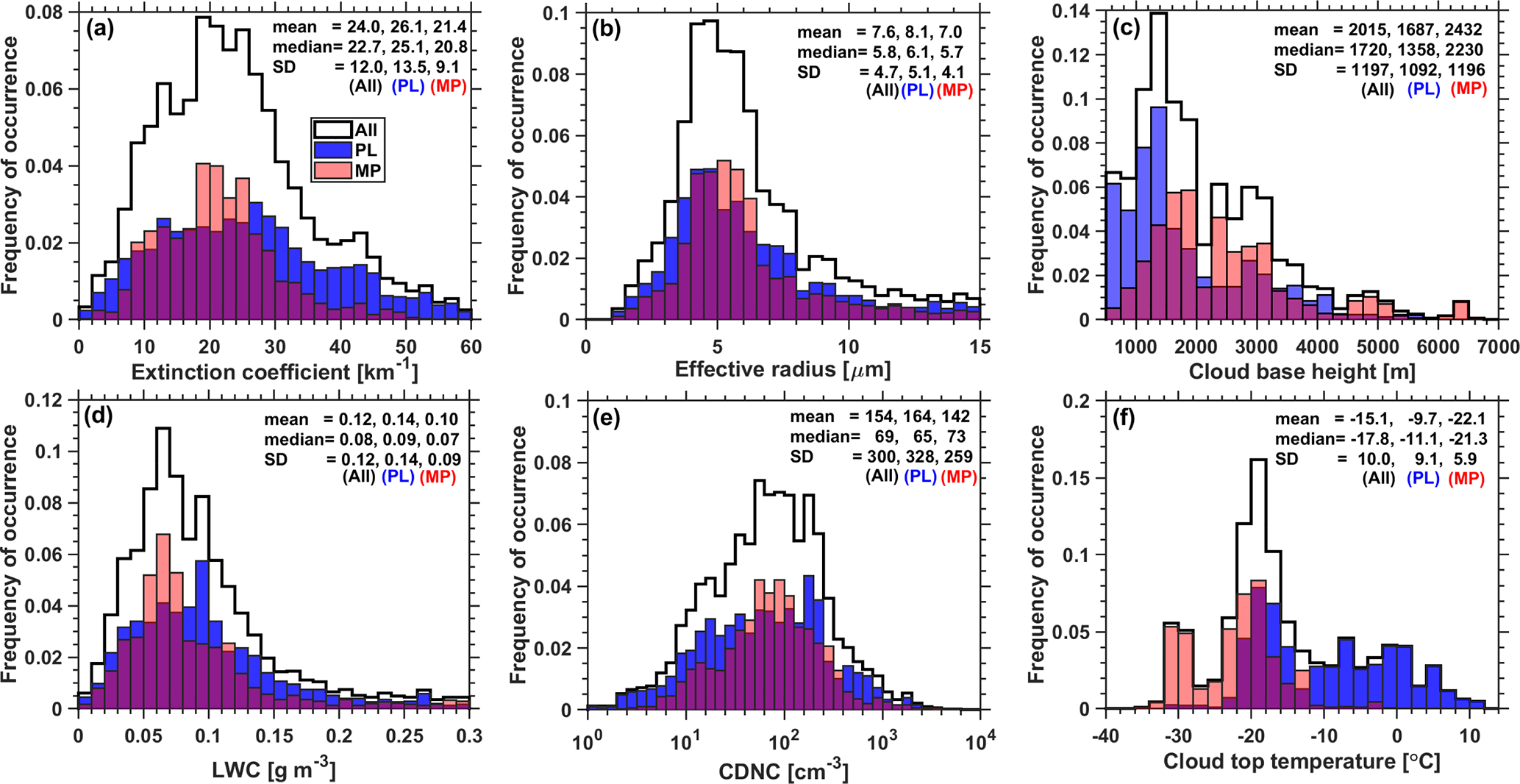 We distinguish pure liquid-water clouds (PL clouds) and MPCs in Sect. 5. All clouds showing virga structures below the cloud top layer were defined as MPCs. Those clouds, which produced no detectable virgae, were classified as pure liquid-water clouds. Cloud base and top heights were obtained from the lidar backscatter and depolarization observation (base heights) and from the radar reflectivity measurements (top heights). The MOSAiC radiosonde temperature data and respective interpolated temperature fields were finally used to assign cloud top temperatures, i.e., the temperatures at which heterogeneous ice nucleation usually starts. In the case of multiple cloud layers, only the lowest layer was considered in the lidar data analysis to avoid undefined biases in the results for the upper layers introduced by the attenuation of laser light and multiple scattering effects in the lowest layer.