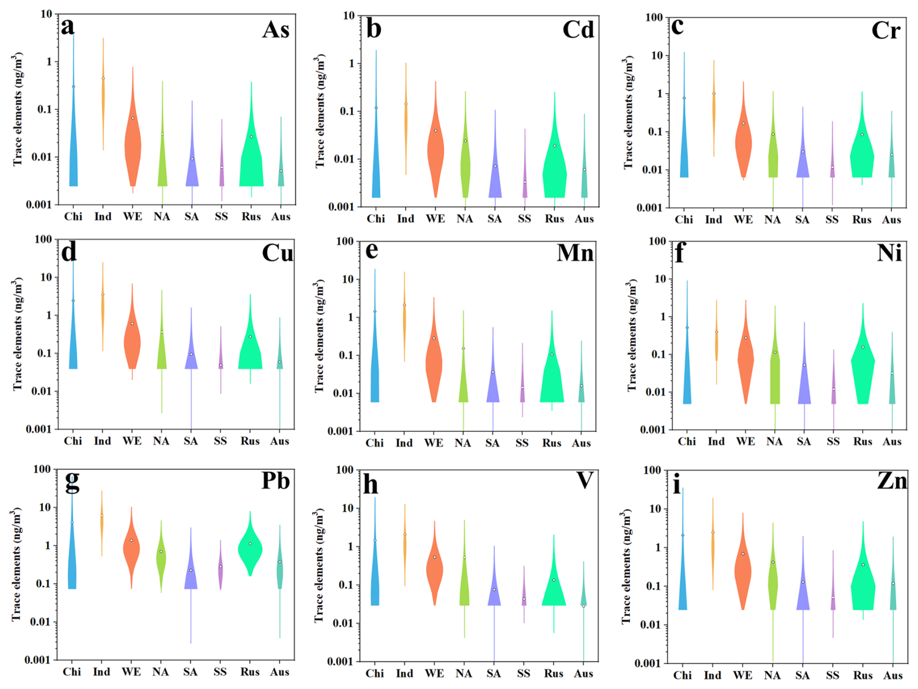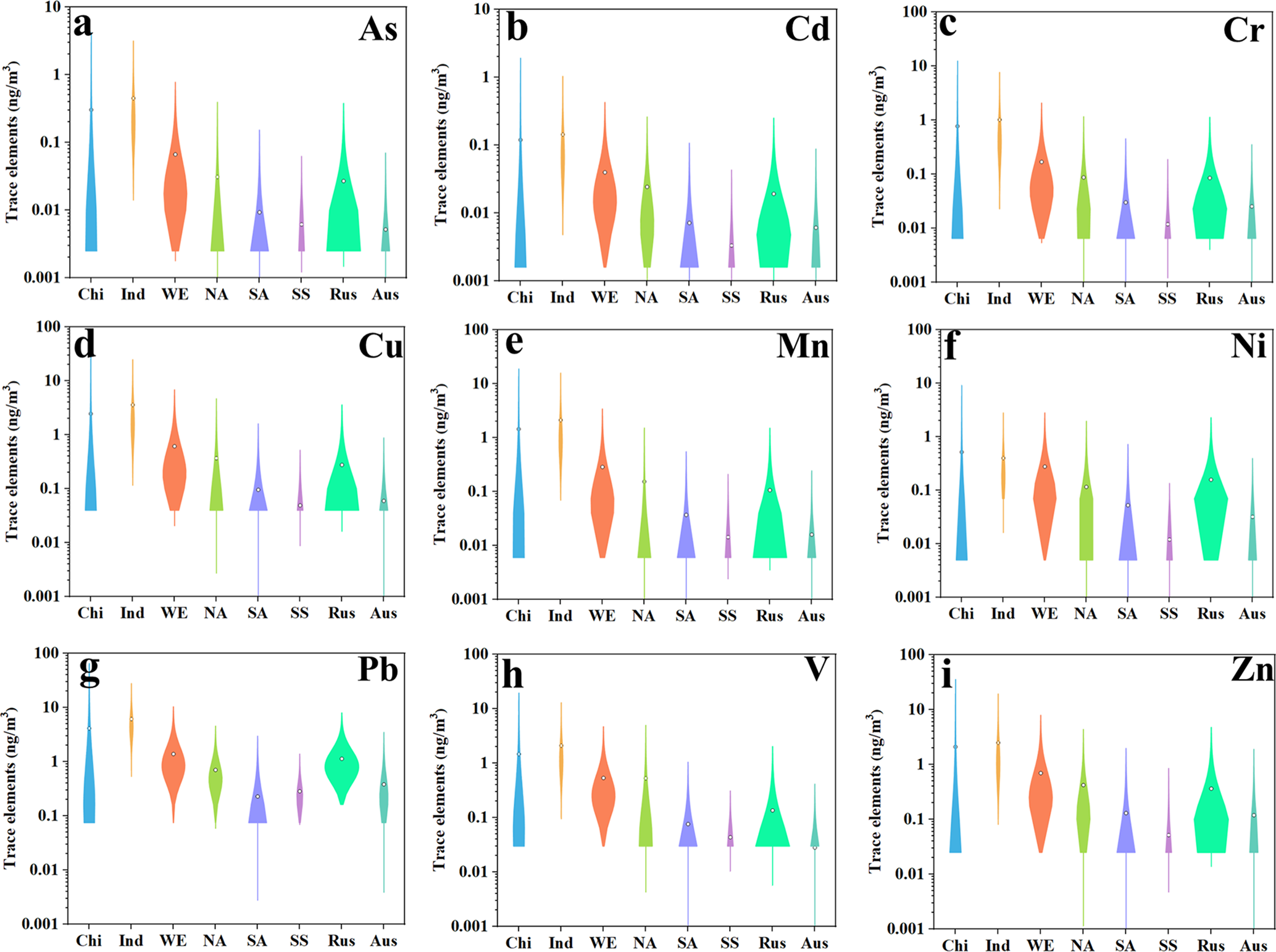 Figure 3The violin graphs of nine trace elements including As (a), Cd (b), Cr (c), Cu (d), Mn (e), Ni (f), Pb (g), V (h), and Zn (i) in eight major regions during January–April in 2020. Chi, Ind, WE, NA, SA, SS, Rus, and Aus represent China, India, Western Europe, North America, South America, Sub-Sahara Africa, Russia, and Australia, respectively.