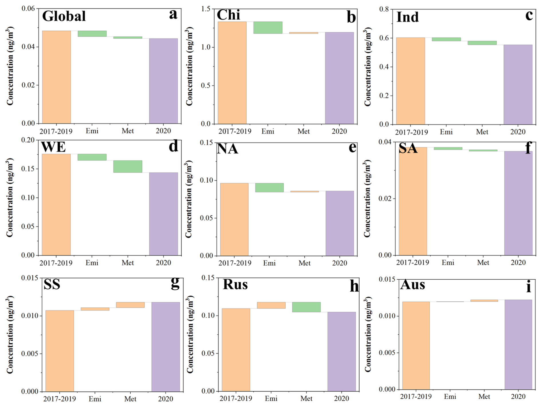 Figure 4The emission and meteorological contributions to ambient As concentrations during 2017–2020 at global and eight major regions. Chi, Ind, WE, NA, SA, SS, Rus, and Aus represent China, India, Western Europe, North America, South America, Sub-Sahara Africa, Russia, and Australia, respectively.
