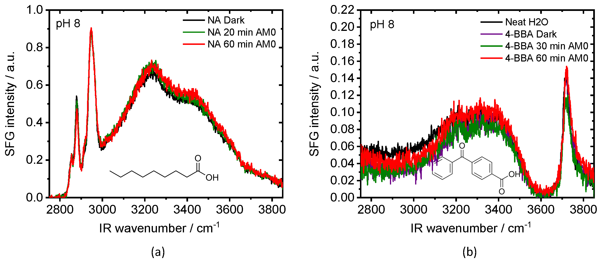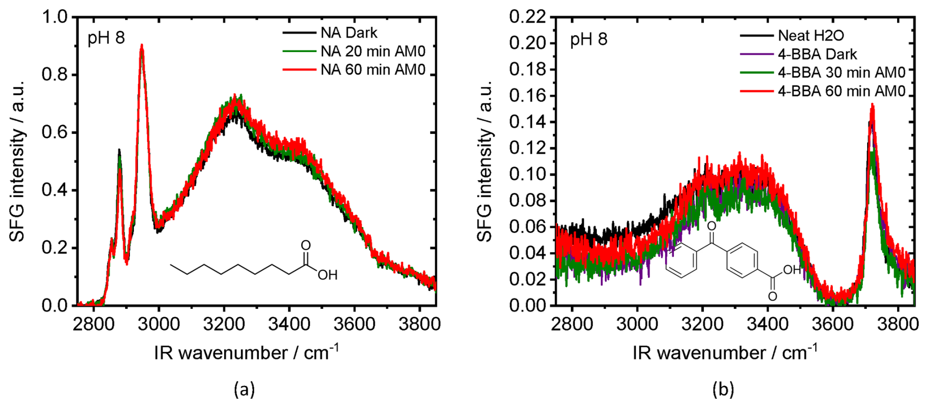 Figure 1SFG at (a) air–water interface for NA (2 mM) and (b) 4-BBA (0.2 mM) as a function of time in dark conditions and after exposure to AM0 light. Both solutions were adjusted to pH 8.