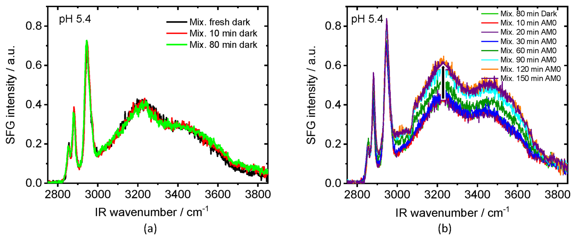 Figure 3SFG spectra at air–water interface of the mixture (2 mM NA + 0.2 mM 4-BBA) at pH 5.4, under dark conditions (a) and irradiation with AM0 (b) conditions.