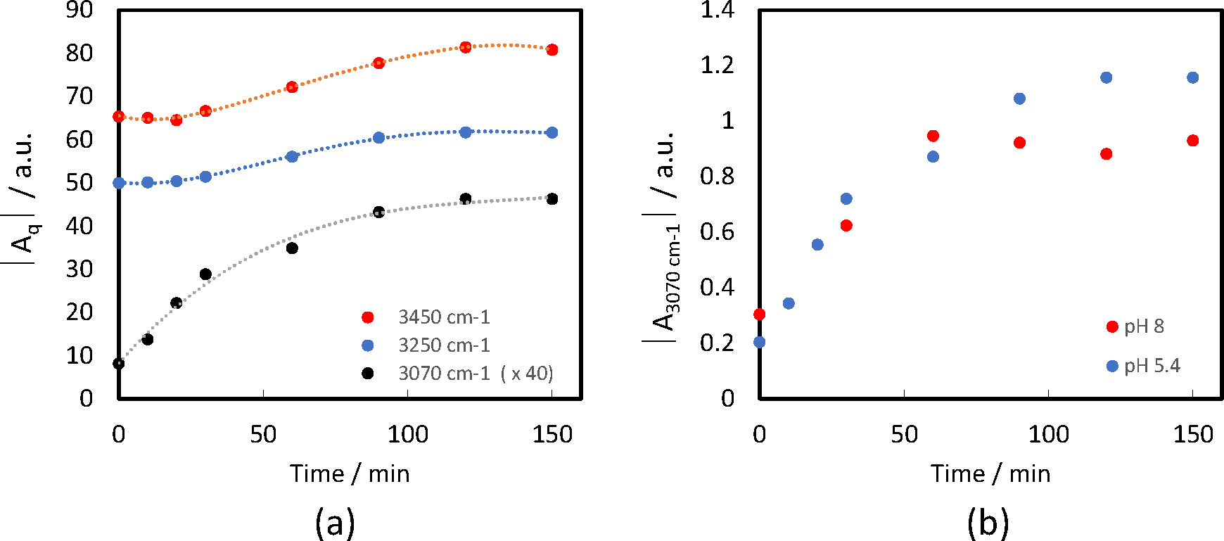 Figure 4Time-dependent changes in the fitted SFG peak amplitudes with AM0 irradiation. (a) The aromatic band (∼ 3070 cm−1) and the two water bands (∼ 3250 and ∼ 3450 cm−1) for the mixture at pH 5.4 (dashed lines are included as visual guides). (b) The aromatic band (∼ 3070 cm−1) for the mixtures at pH 5.4 and pH 8.