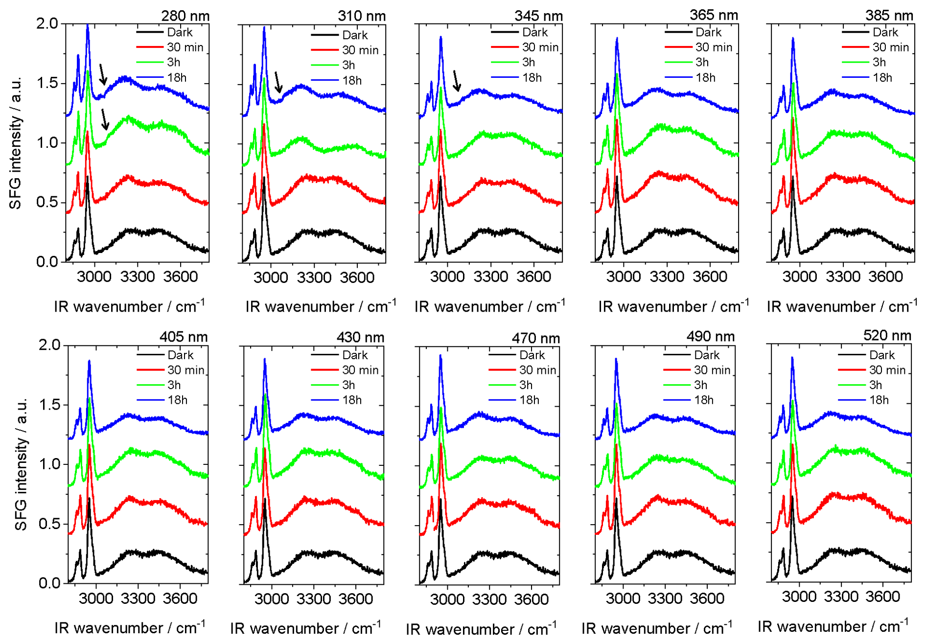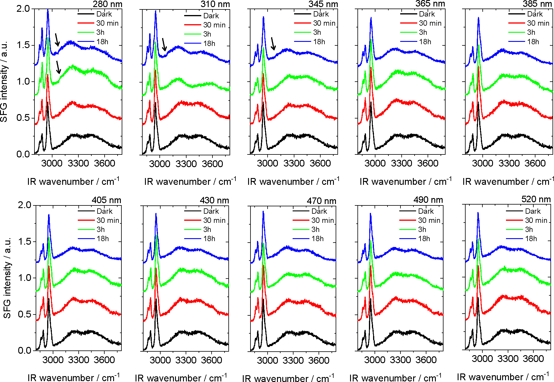 Figure 6SFG spectra at air–water interfaces of (2 mM NA + 0.2 mM 4-BBA) mixtures at pH 5.6 after different times of irradiation with different wavelengths. Note that the spectra have a constant with offset.