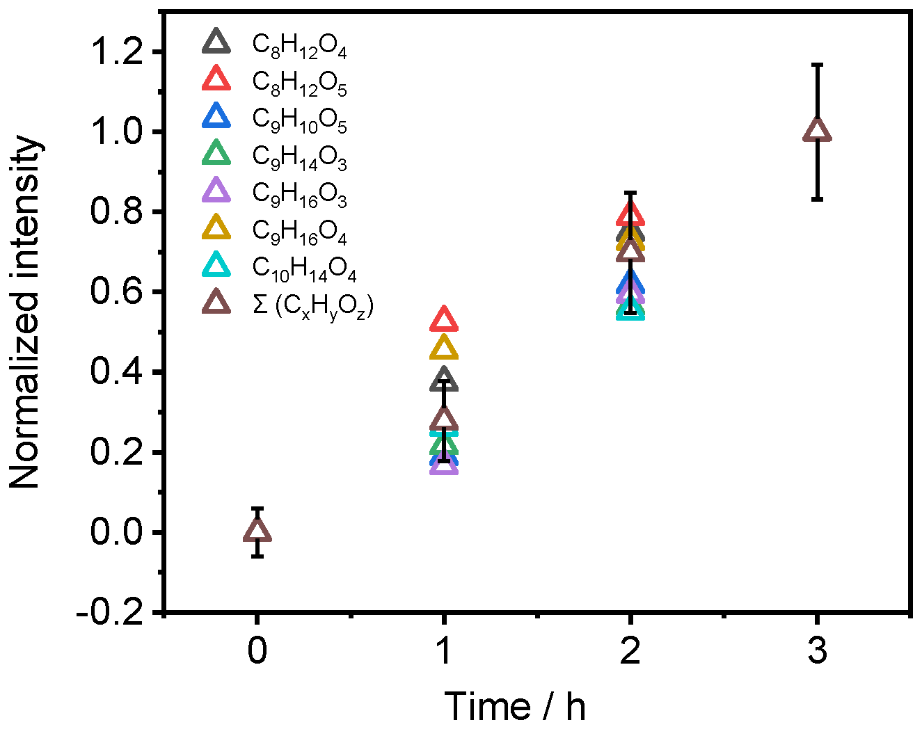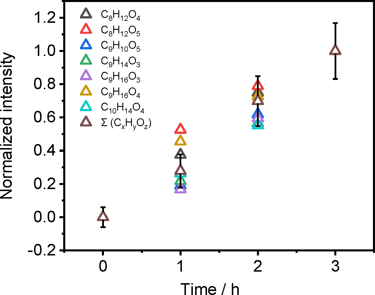 Figure 7Intensities of individual photoproducts as a function of exposure time to AM0 irradiation (Exp. MS.1), normalized to the total liquid-phase signal intensity Σ (CxHyOz). Error bars represent the uncertainty associated with the analytical measurements.