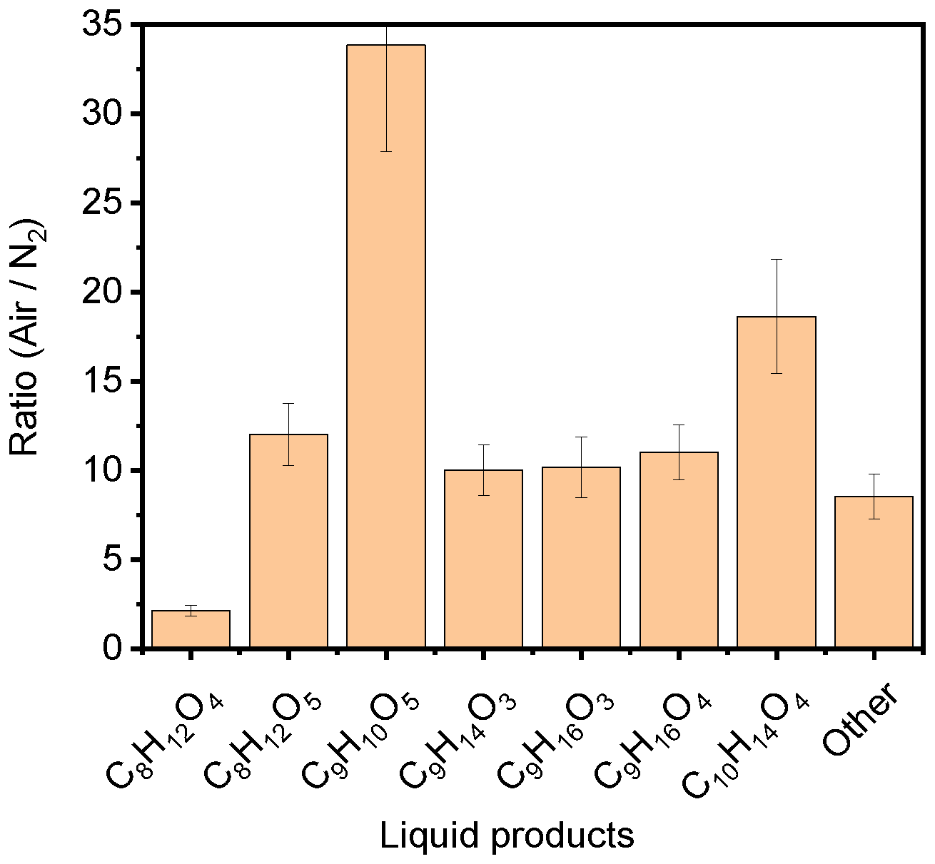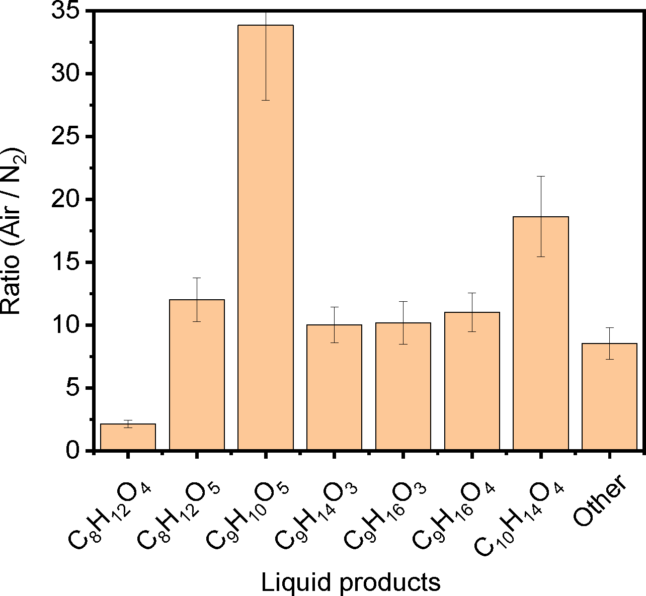 To examine the role of oxygen in the reactions, we repeated the AM0 experiment with pure nitrogen, instead of the synthetic air, and deoxygenated liquid solutions (Exp. MS.3). The solution was deoxygenated by bubbling with nitrogen for 10 min, and the measuring cell was purged before closing it hermetically. Figure 9 shows the ratio of signals detected in the presence of synthetic air versus those in the presence of N2. The results show that the presence of oxygen causes an increase in C8H12O5, C9H14O3, C9H16O3, and C9H16O4 by a factor of 10 to 12. The presence of oxygen shows only a limited promotion on the formation of C8H12O4 (factor of ∼ 2) but a significant promotion on the formation of C10H14O4 (factor of ∼ 19) and C9H10O5 (factor of ∼ 34). This emphasizes the vital role of dissolved oxygen in the natural bodies of water to develop multiple pathways of interactions.