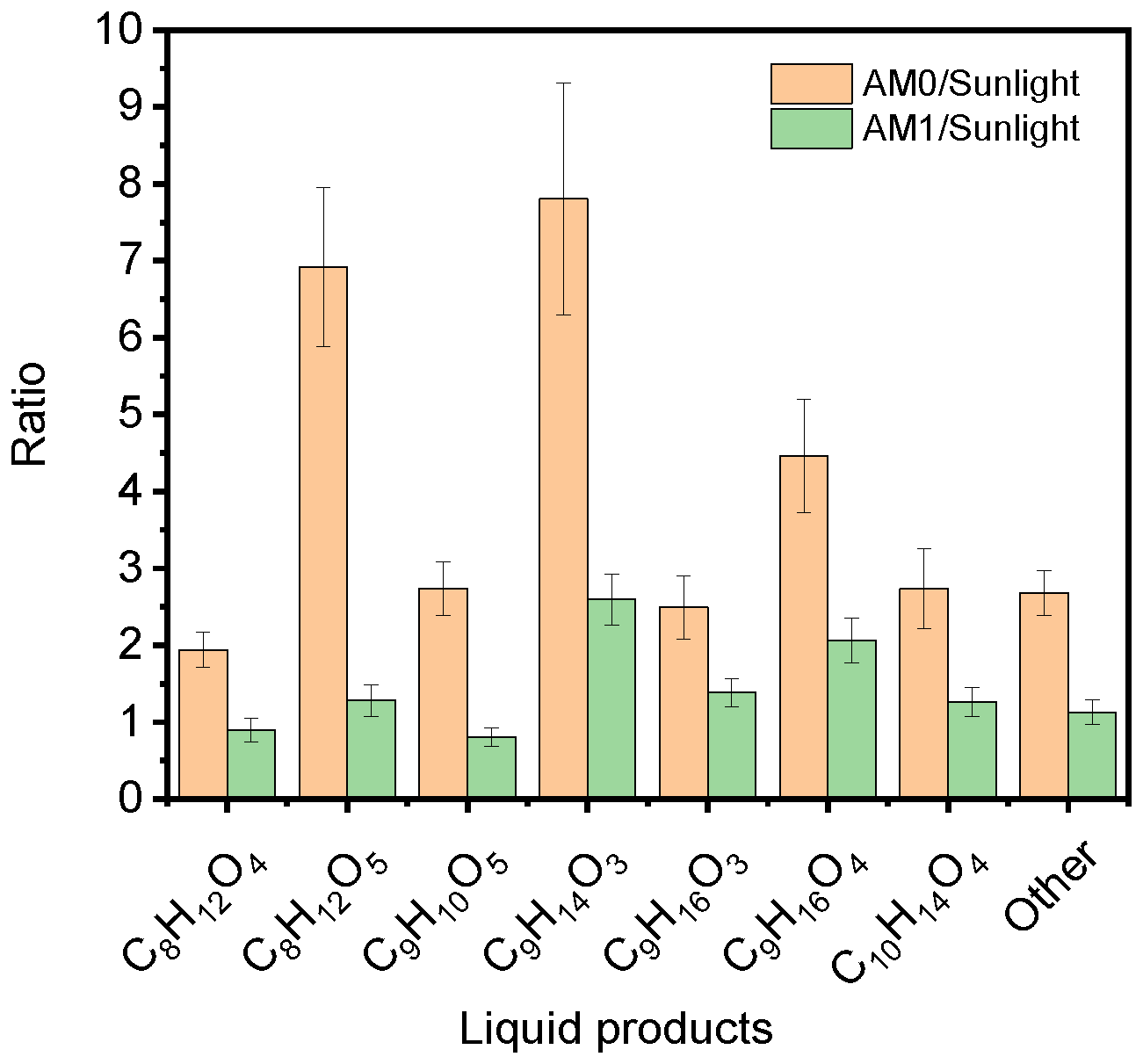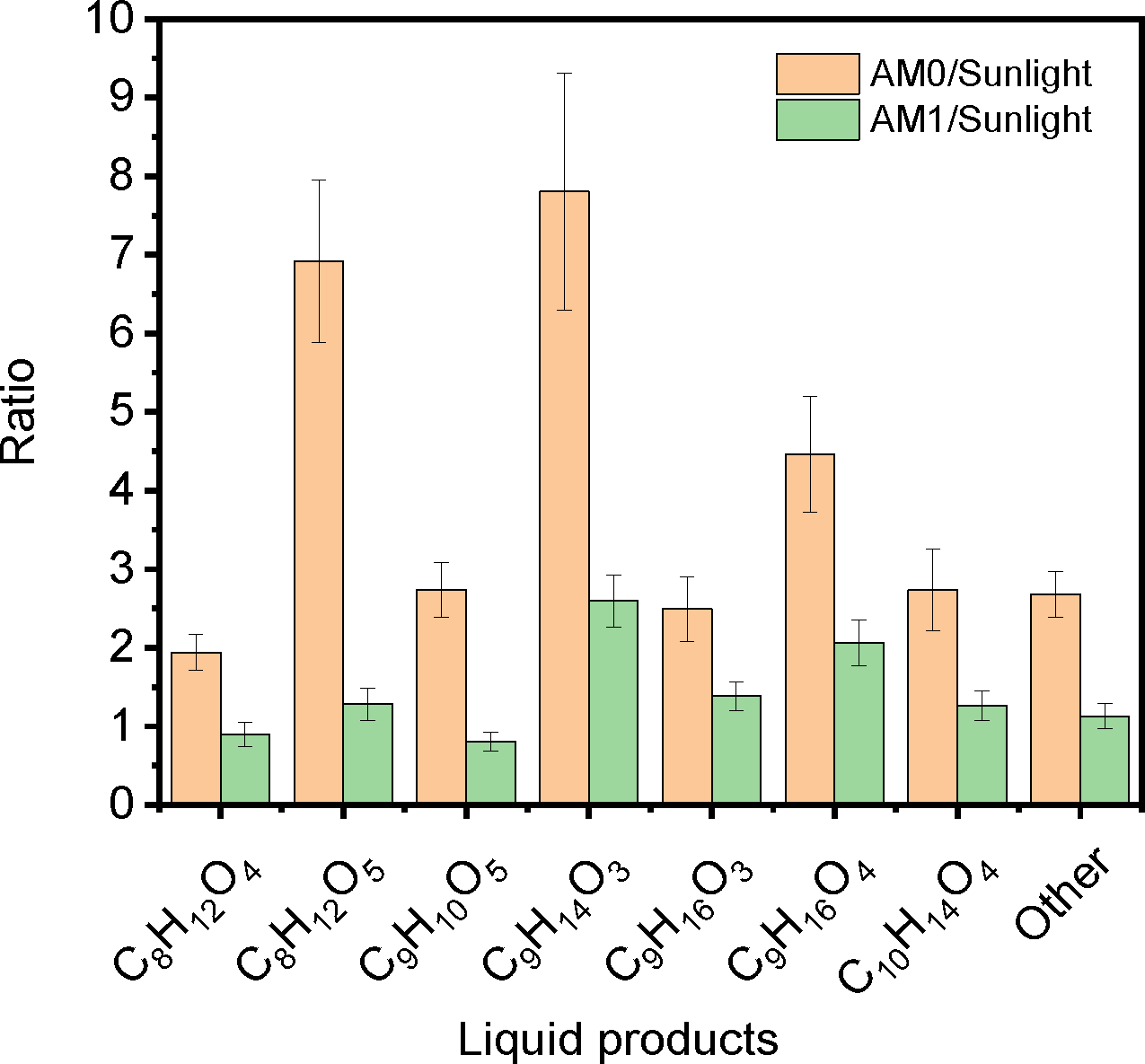 Figure 11Ratio of the compounds detected with AM0 or AM1 versus the signal with sunlight, for a NA aqueous solution with 4-BBA after irradiation for 3 h.