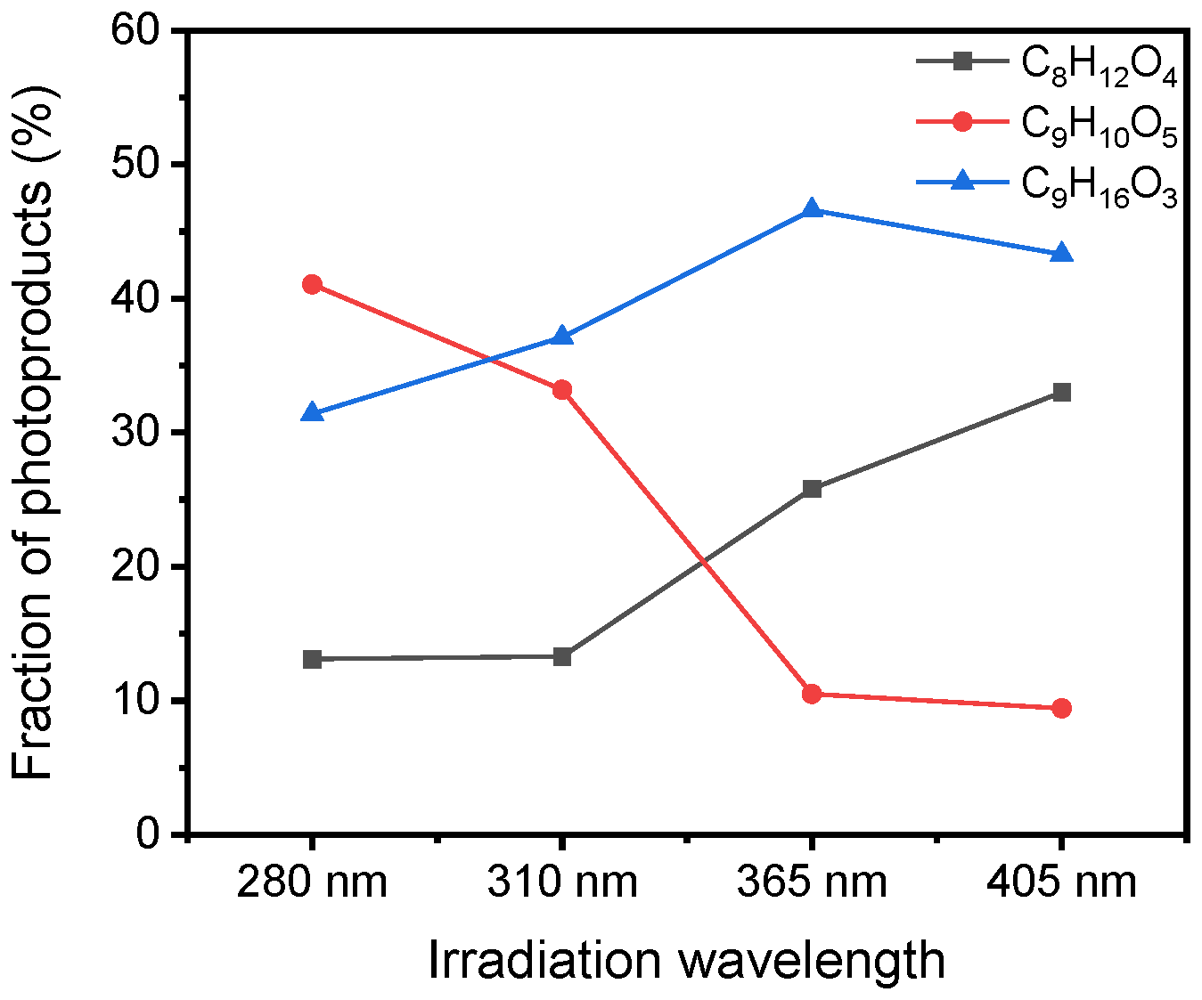 Figure 12The fraction of photoproducts versus wavelength for the three most dominating products (C8H12O4, C9H10O5, and C9H16O3) in a NA aqueous solution with 4-BBA after irradiation with 280, 310, 365, and 405 nm for 3 h.