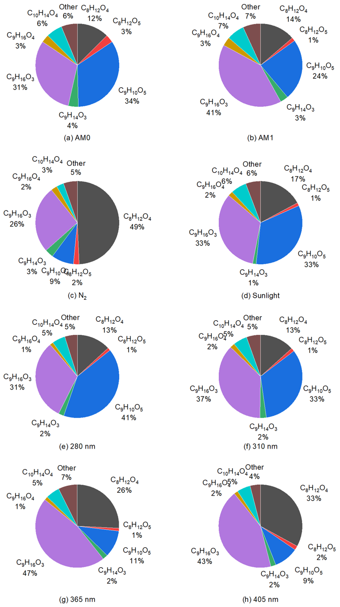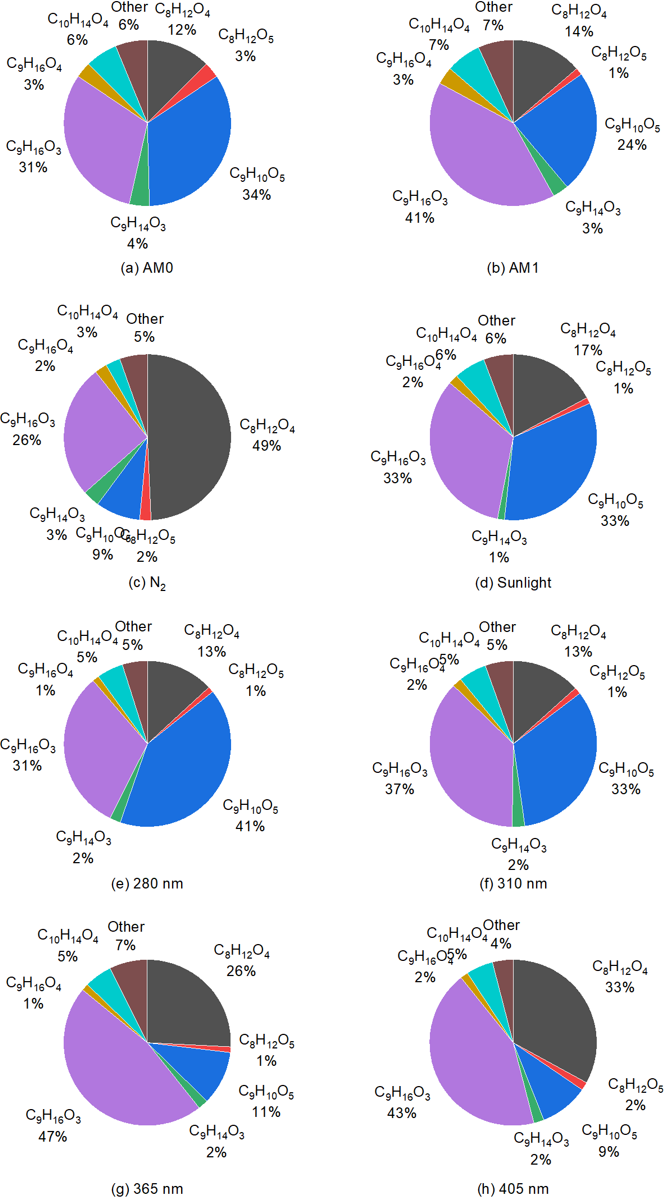 Figure 13Fractions of products in total liquid-phase CxHyOz under different irradiation conditions. All panels represent experiments conducted in air, except panel (c), which corresponds to an experiment performed in pure nitrogen.