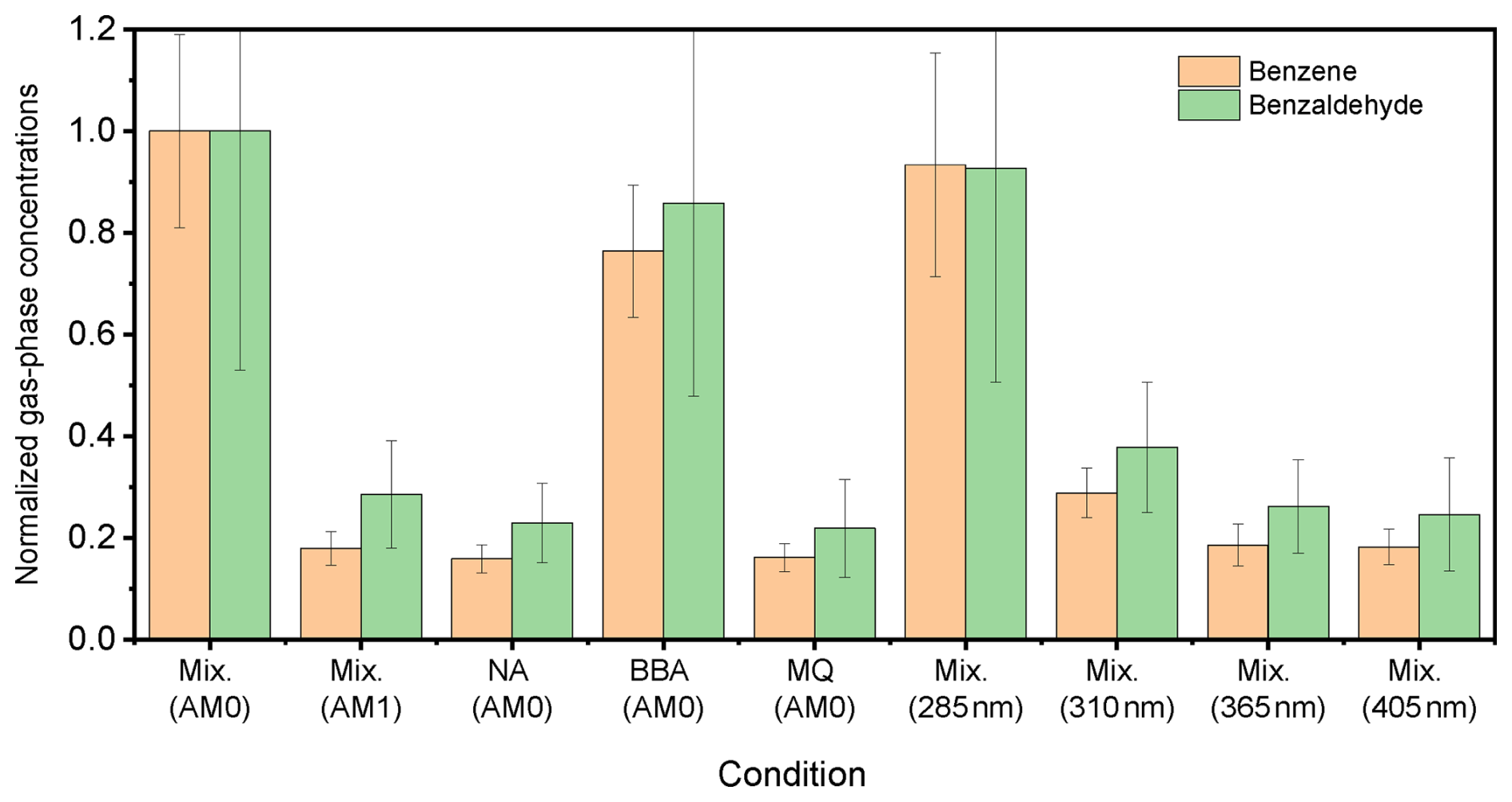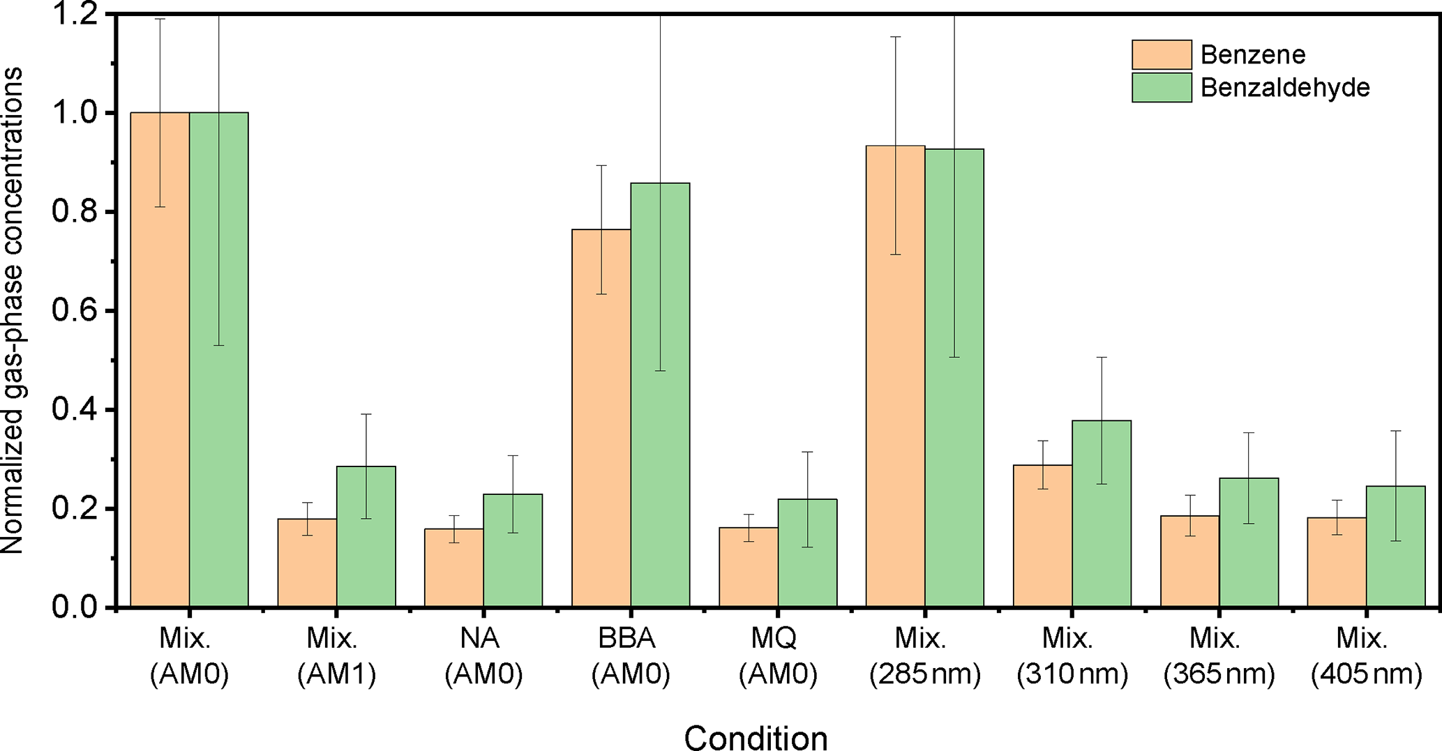 Only two of the photoproducts detected in the gas phase showed a significant increase compared to the background experiments (BG1–3). Figure 14 shows the normalized signals of the two main gas-phase compounds, benzene (C6H6) and benzaldehyde (C7H6O), under different irradiation conditions. When NA was irradiated in the absence of 4-BBA, the signal from both products remained at background levels. However, when either the mixture or 4-BBA alone was irradiated with AM0, both compounds exhibited strong signals. This is a further confirmation that, in addition to the previously reported photosensitized degradation of NA in the presence of 4-BBA as a photosensitizer, 4-BBA itself undergoes photolysis under the influence of the UV portion of the light spectrum. For other gas-phase compounds detected in this study, no significant differences were observed between the irradiation experiments and the background experiments.