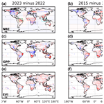 Figure 4 shows the geographical distribution of changes in parameters that describe large-scale CO2 flux changes – temperature and water availability. Geographical locations where we report the largest increases in NBE (and largest reductions in GPP) in 2023 – e.g. Brazil, southern Africa, and southeastern Australia – are coincident with locations where we saw some of the largest increases in temperature and VPD and the largest reductions in LWE. Where we reported the largest decreases in NBE (and the largest increases in GPP), e.g. parts of the contiguous USA and central Canada, we saw cooler temperatures and lower VPDs and small increases in LWE. We find a similar level of consistency between the data products and meteorological reanalyses in 2015. Recent work using an ensemble of dynamic global vegetation models highlighted the detrimental impact of warming on tropical ecosystems (Sitch et al., 2024), consistent with our results.