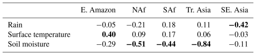 Table A1Normalized linear-fitting coefficients for the independent variables of the MERRA2 rain, surface temperature, and soil moisture used to fit the NBE anomalies (Fig. 5) for the regions defined in Fig. 3a, 2014–2023, inclusively. The largest coefficient for each region is highlighted in bold.