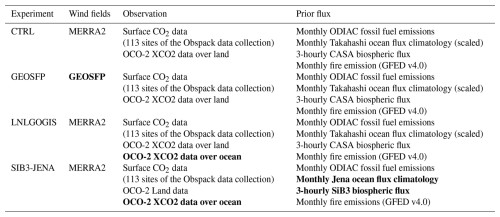 The GEOSFP inversion is driven by GMAO Goddard Earth Observing System Forward Processing (GEOS-FP) meteorological analyses, based on a convection scheme that is different from the one used in the MERRA2 reanalysis, which we use in our control experiment (CNTRL). For the inversion using OCO-2 land nadir, land glint, and ocean glint data, and in situ data (LNLGOGIS) inversion, we use additional OCO-2 XCO2 sun-glint retrievals collected over the oceans. The SIB3-JENA inversion includes alternative a priori estimates for sea–air CO2 fluxes based on CO2 observations (Rödenbeck et al., 2022) and for biosphere–atmosphere fluxes from the SiB3 model simulation (Baker et al., 2009).