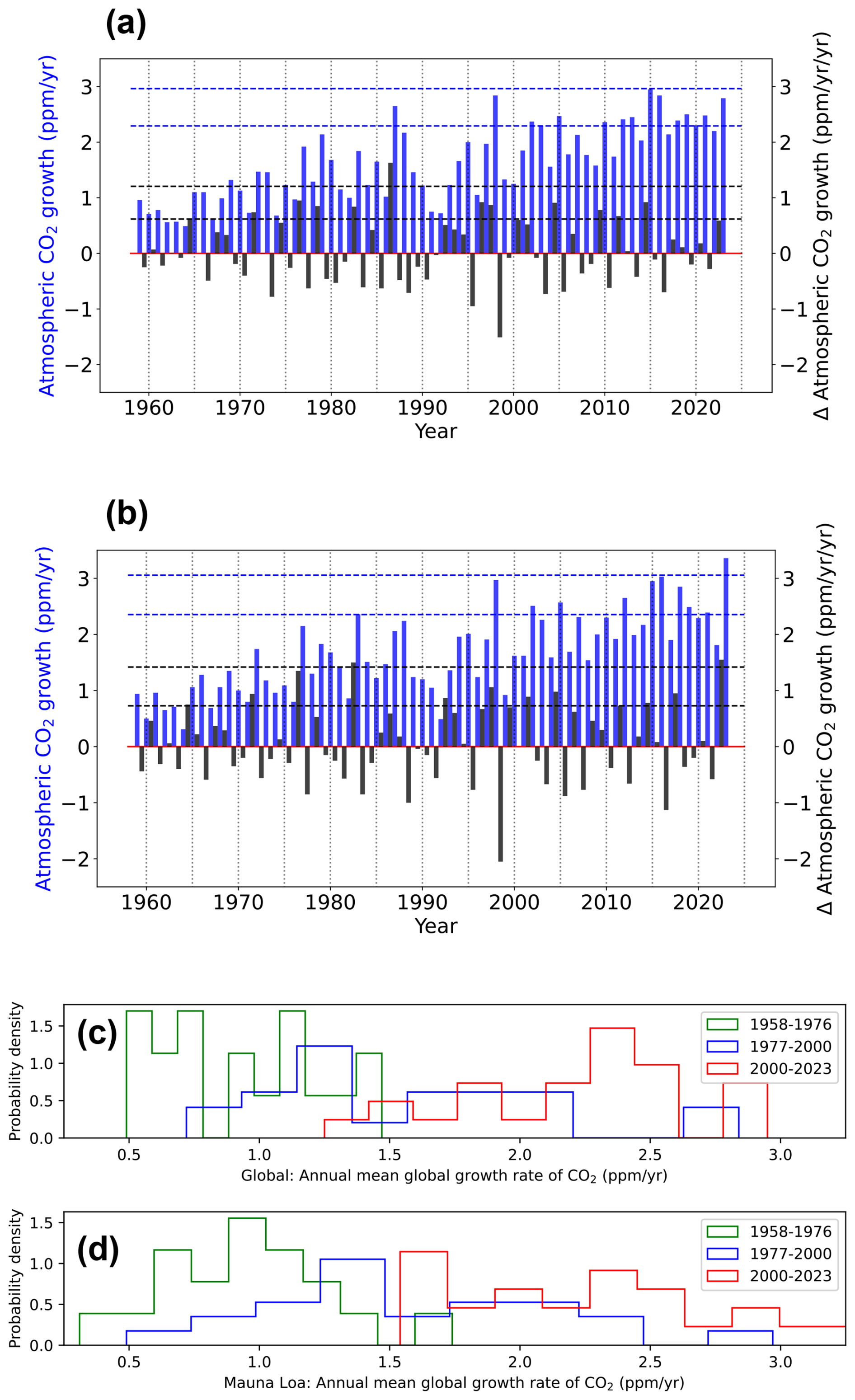 Figure 1Atmospheric growth rates of CO2 (blue) and their annual change (black). (a) Global mean values. (b) Values determined from the Mauna Loa, Hawaii CO2 mole fraction data. Data collected by the NOAA and available at https://gml.noaa.gov/ccgg/trends/gl_gr.html (last access: 16 June 2024). (c) Multi-decadal changes in the probability density of global mean annual mean growth rates and (d) as panel (c) but using data from Mauna Loa. Blue and black dashed horizontal lines denote the 1σ and 2σ values for the annual atmospheric CO2 growth and its annual change, respectively.