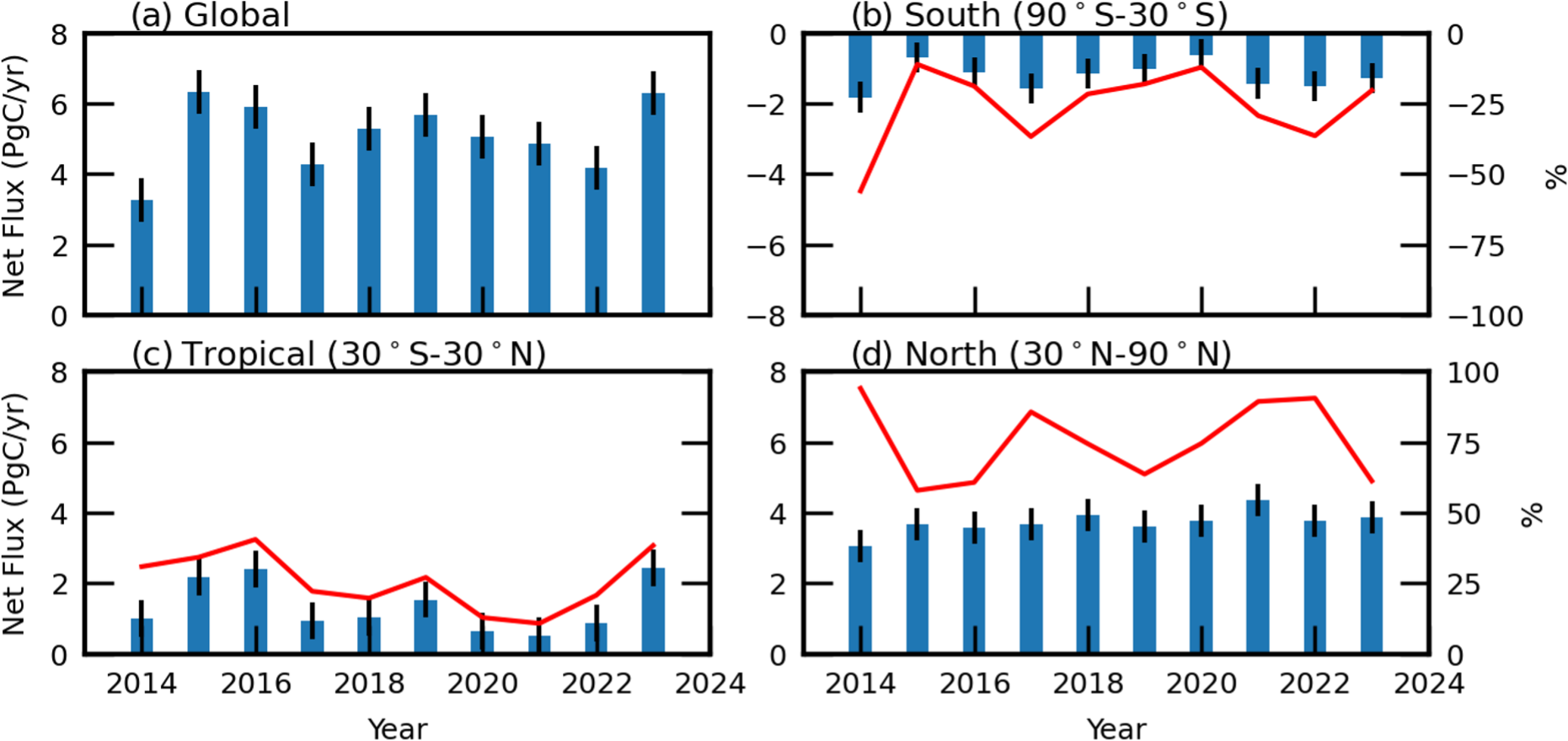 Figure 2 shows a posteriori net fluxes of CO2 on a global scale and across southern, tropical, and northern latitudes to provide some broad geographical context. These values are broadly consistent with annual values for the atmospheric CO2 growth rates – an important zeroth-order assessment of our a posteriori net fluxes. Our value for 2023, inferred from OCO-2 data, is 3.0 ppm yr−1, about 0.2 ppm yr−1 higher than the value inferred from NOAA CO2 mole fraction data. We acknowledge that CO2 growth rate estimates inferred from NOAA data can depart from the true value based on whole-atmosphere CO2 changes (Pandey et al., 2024). Building on our ongoing model evaluation, e.g. Deng et al. (2024) and Friedlingstein et al. (2025), we find that the a posteriori CO2 concentrations for 2023 are generally within 0.5 ppm of data collected by spectrometers from the Total Carbon Column Observing Network (TCCON) (Wunch et al., 2011), with a standard deviation smaller than 1.2 ppm.