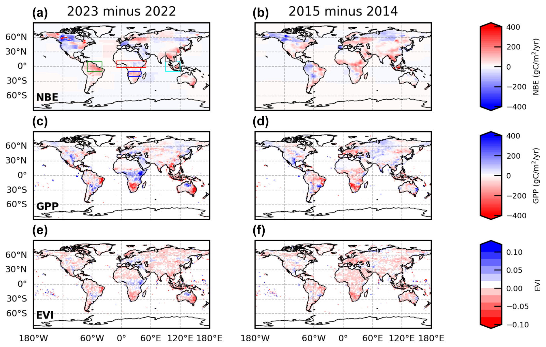 Figure 4 shows the geographical distribution of changes in parameters that describe large-scale CO2 flux changes – temperature and water availability. Geographical locations where we report the largest increases in NBE (and largest reductions in GPP) in 2023 – e.g. Brazil, southern Africa, and southeastern Australia – are coincident with locations where we saw some of the largest increases in temperature and VPD and the largest reductions in LWE. Where we reported the largest decreases in NBE (and the largest increases in GPP), e.g. parts of the contiguous USA and central Canada, we saw cooler temperatures and lower VPDs and small increases in LWE. We find a similar level of consistency between the data products and meteorological reanalyses in 2015. Recent work using an ensemble of dynamic global vegetation models highlighted the detrimental impact of warming on tropical ecosystems (Sitch et al., 2024), consistent with our results.