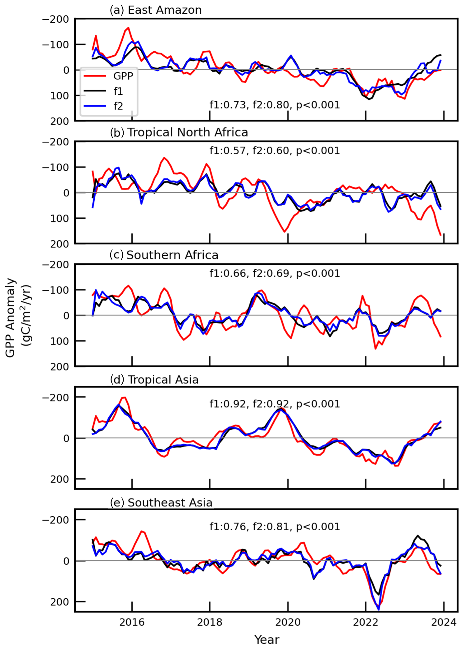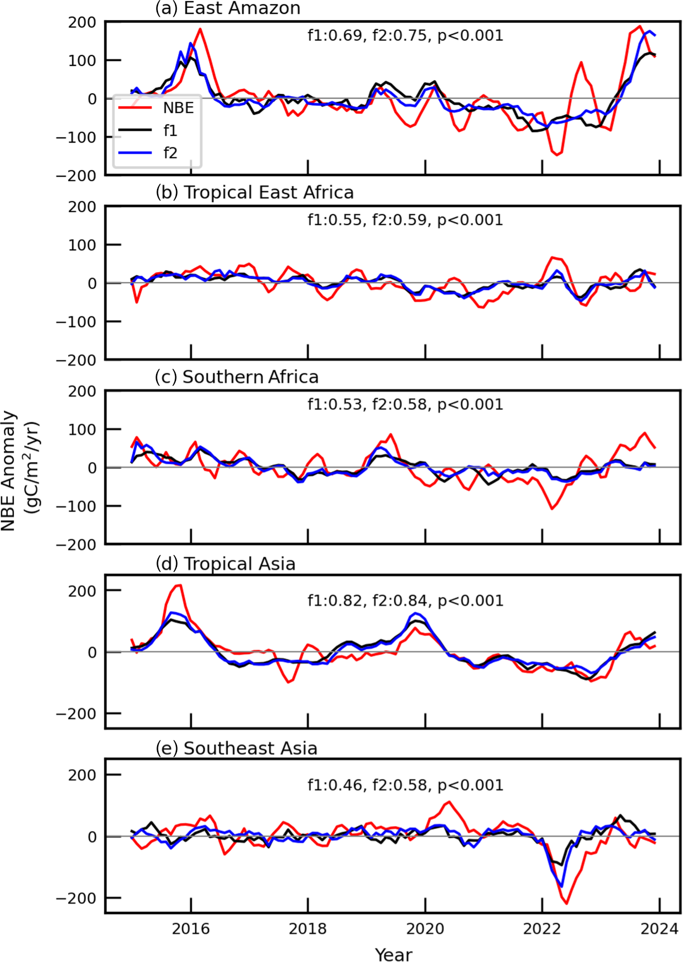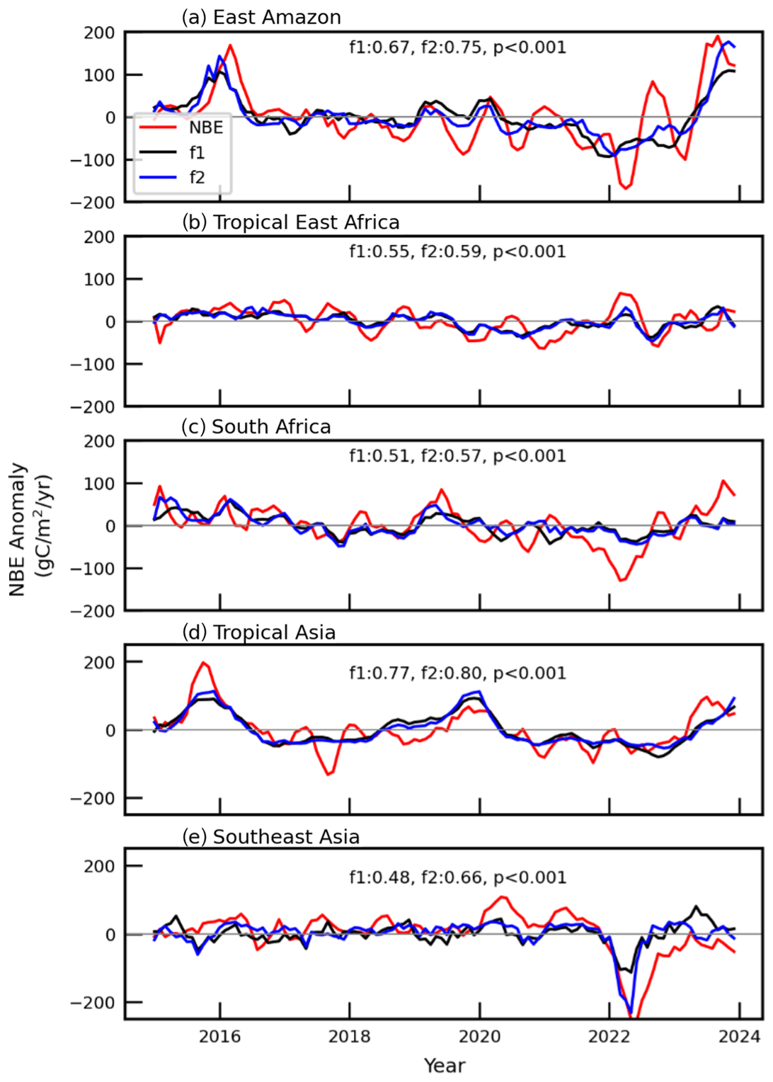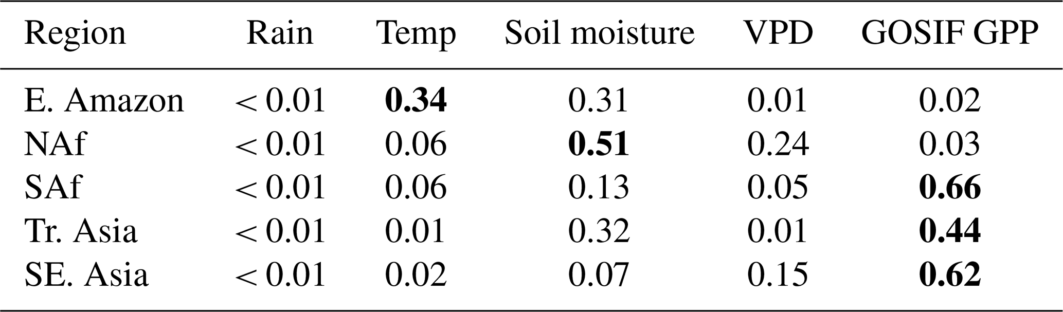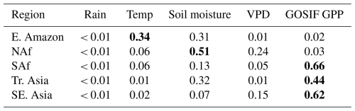 Figure 5 describes these relationships more quantitatively by using linear and quadratic multivariate fits of MERRA2 rainfall, temperature, and soil moisture anomalies to our a posteriori NBE anomalies, 2014–2023, inclusively, over the geographical regions highlighted in Fig. 3a. For the linear fits (f1), we assume that the a posteriori NBE anomalies are a linear function of the MERRA2 rainfall (R), surface temperature (TS), and soil moisture (SM) anomalies: ΔNBE = , where Δ denotes an anomaly, αx denotes the regression coefficient for a particular variable x, and Δ0 denotes the fitting residual. We scale these anomalies by their respective standard deviations and smooth them by applying a 4-month moving window to reduce the noises and to (partially) account for the time lag between flux and environmental drivers. We use a least-squares method to estimate the four regression coefficients, which we report in Table A1, with results from our sensitivity tests shown in Table B2. We also consider a quadratic regression model (f2) to explain the NBE anomalies, including linear and quadratic terms for the same three quantities used in the linear model but without cross terms; we found that this only marginally outperforms the linear model. Both models are statistically significant, with p values < 0.001, so for simplicity of interpretation we use the linear fit. In sensitivity calculations, we find that changes in VPD or LWE do not improve the fits to the NBE anomalies. The models capture most of the NBE changes, with the notable exception of mid-2022 when our NBE fluxes show a sharp increase that is not explained by temperature or water. Based on the normalized linear-fitting coefficients, we find for these fits that changes in temperature explain most of the NBE changes we observe over the eastern Amazon (Table A1 and Fig. B3), but soil moisture changes are more important over northern tropical Africa, southern Africa, and tropical Asia (Table A1 and Fig. B3). Rainfall changes are more important over Southeast Asia. Independent GOSIF GPP estimates determined from satellite SIF observations (Li and Xiao, 2019) show a significant decrease from 2022 to 2023 over tropical regions, particularly over the eastern Amazon, southern Africa, tropical Asia, and Southeast Asia (Fig. A4), consistent with the increase we report for our a posteriori NBE estimates (Fig. 5). More generally, we find that changes in GOSIF GPP are better than other individual predictors at describing our a posteriori CO2 flux anomalies over tropical Asia, Southeast Asia, and southern Africa. Table A2 shows the permutation importance of individual predictors in our multivariate linear models.