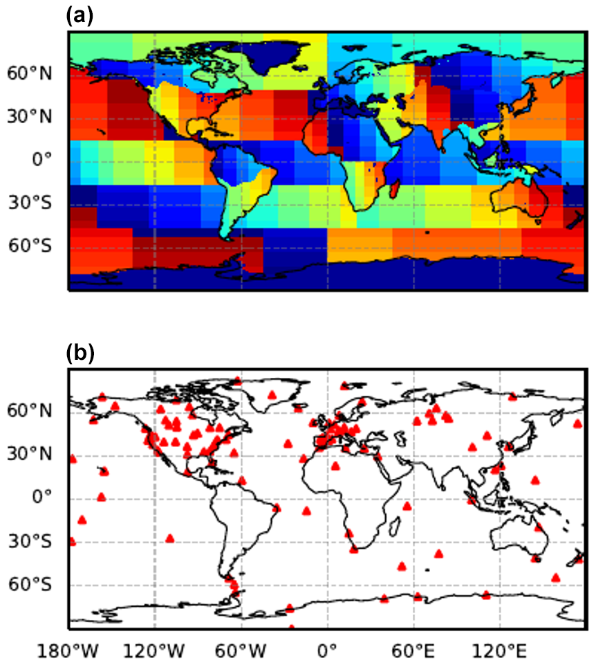 Figure A1(a) The distribution of 488 subregions – including 356 land regions and 132 oceanic regions – for which we report monthly a posteriori CO2 flux estimates inferred from OCO-2 data. (b) The geographical locations of the ground-based measurements of the CO2 mole fraction.