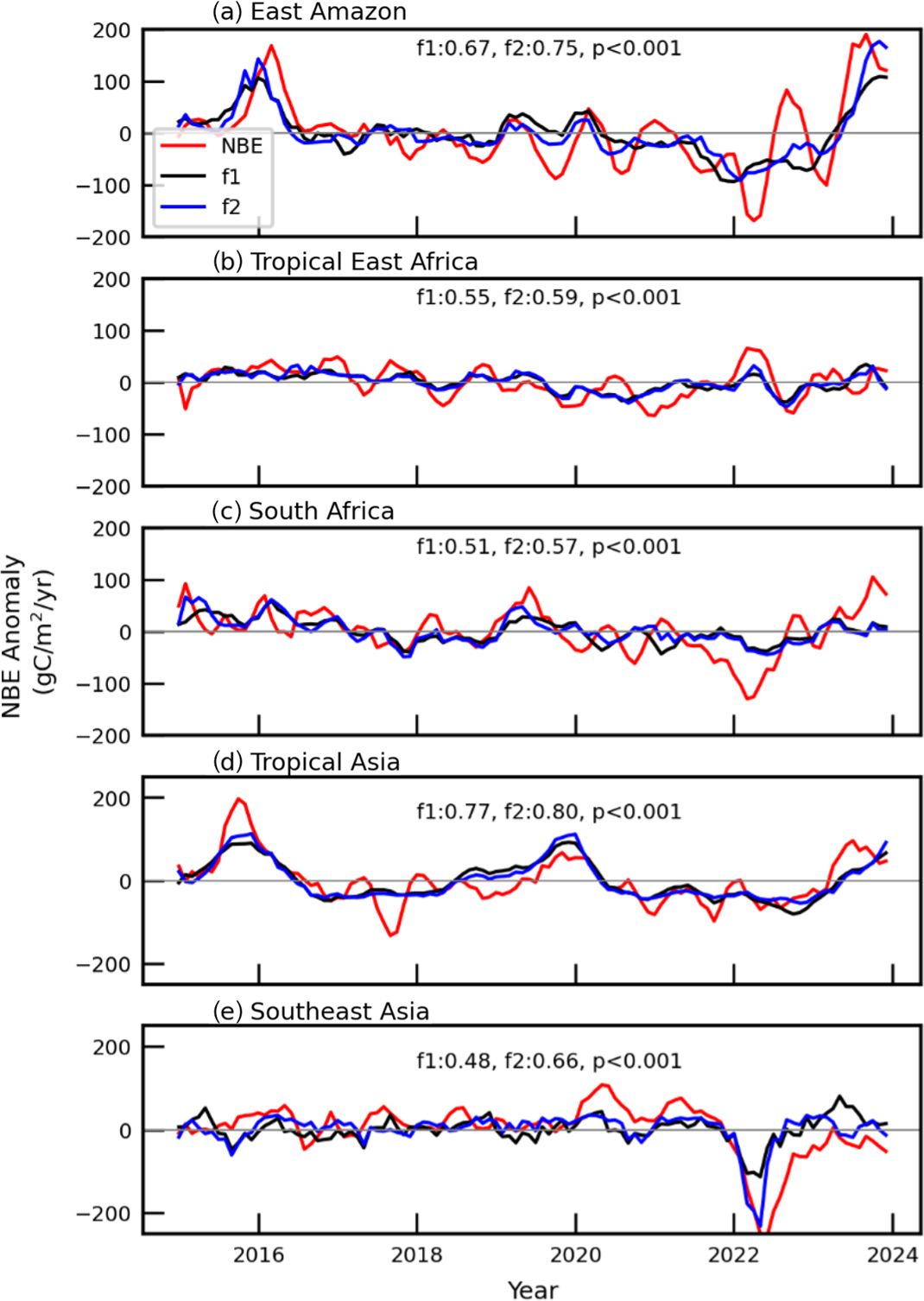 Figure 5Regional linear (black) and quadratic (blue) multivariate fits of NBE anomalies (red) inferred from OCO-2 data using independent estimates of rainfall, surface temperature, and soil moisture from MERRA reanalyses data products from the NASA GSFC GMAO. Regional definitions, defined in panel (a) of Fig. 3, include the eastern Amazon, tropical East Africa, southern Africa, tropical Asia, and Southeast Asia. Inset numbers shown in each panel indicate the Pearson correlation coefficient for each fit and the p value that corresponds to both fits.