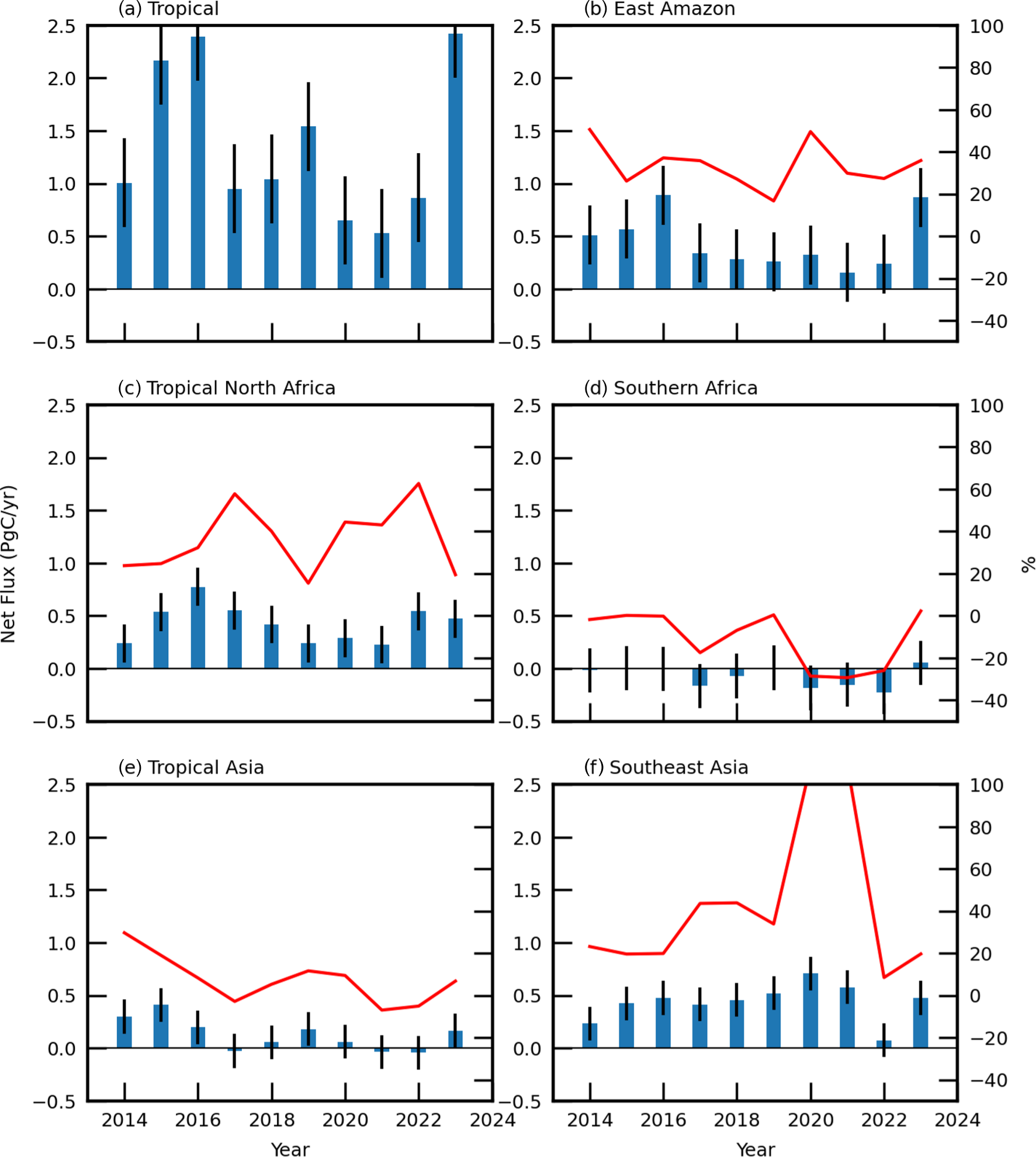 Gui, Y., Wang, K., Jin, Z., Wang, H., Deng, H., Li, X., Tian, X., Wang, T., Chen, W., Wang, T., and Piao, S.: The decline in tropical land carbon sink drove high atmospheric CO2 growth rate in 2023, National Science Review, 11, nwae365, https://doi.org/10.1093/nsr/nwae365, 2024.
