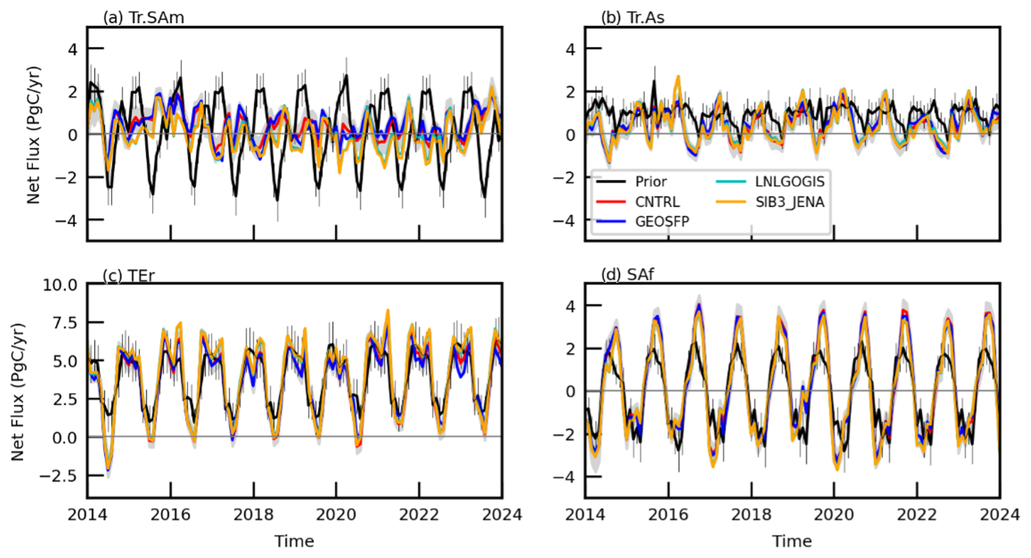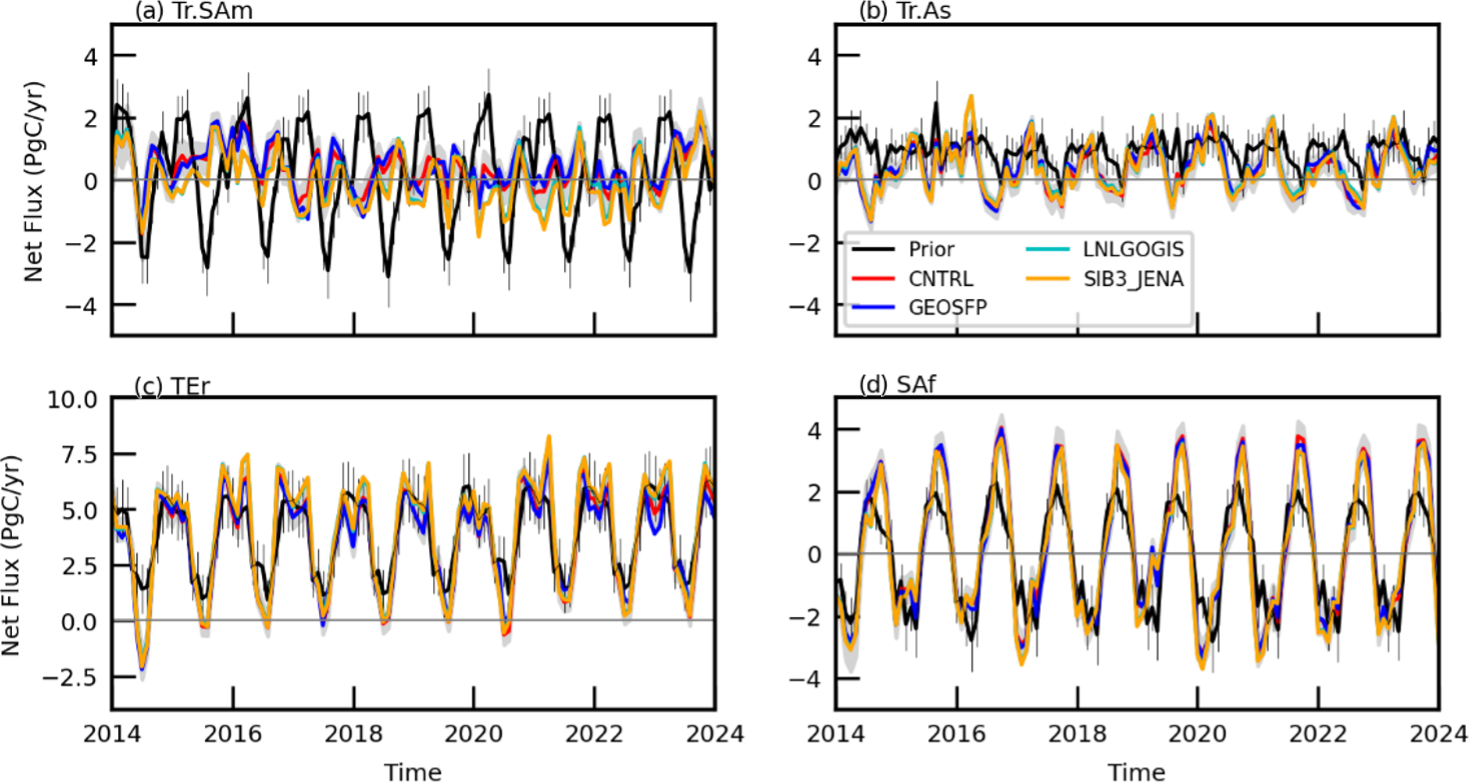Figure B1Monthly regional flux estimates by four inversion experiments (CNTRL, GEOSFP, LNLGOGIS, and SIB3-JENA) over four TransCom-3 regions: (a) Tr.SAm (tropical South America), (b) Tr.As (tropical Asia), (c) TEr (temperate Eurasia), and (e) Saf (southern Africa). The uncertainties for a priori and a posteriori estimates from the inversions are denoted by vertical lines and shaded envelopes, respectively.