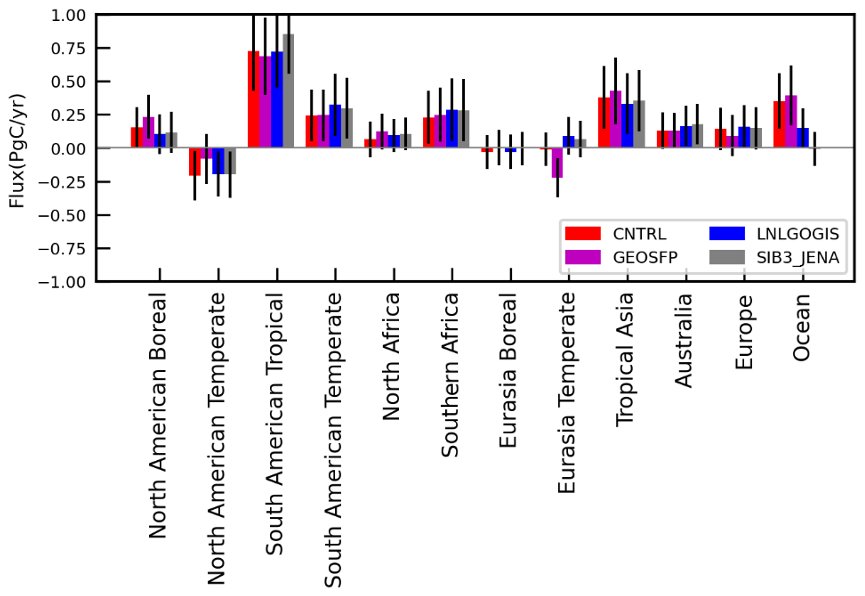 Adopting a widely used approach, we assume that the fossil fuel emissions are well known and estimate monthly a posteriori natural CO2 fluxes, including fire emissions and terrestrial and ocean biospheric CO2 fluxes, which are approximated by Feng et al. (2017):