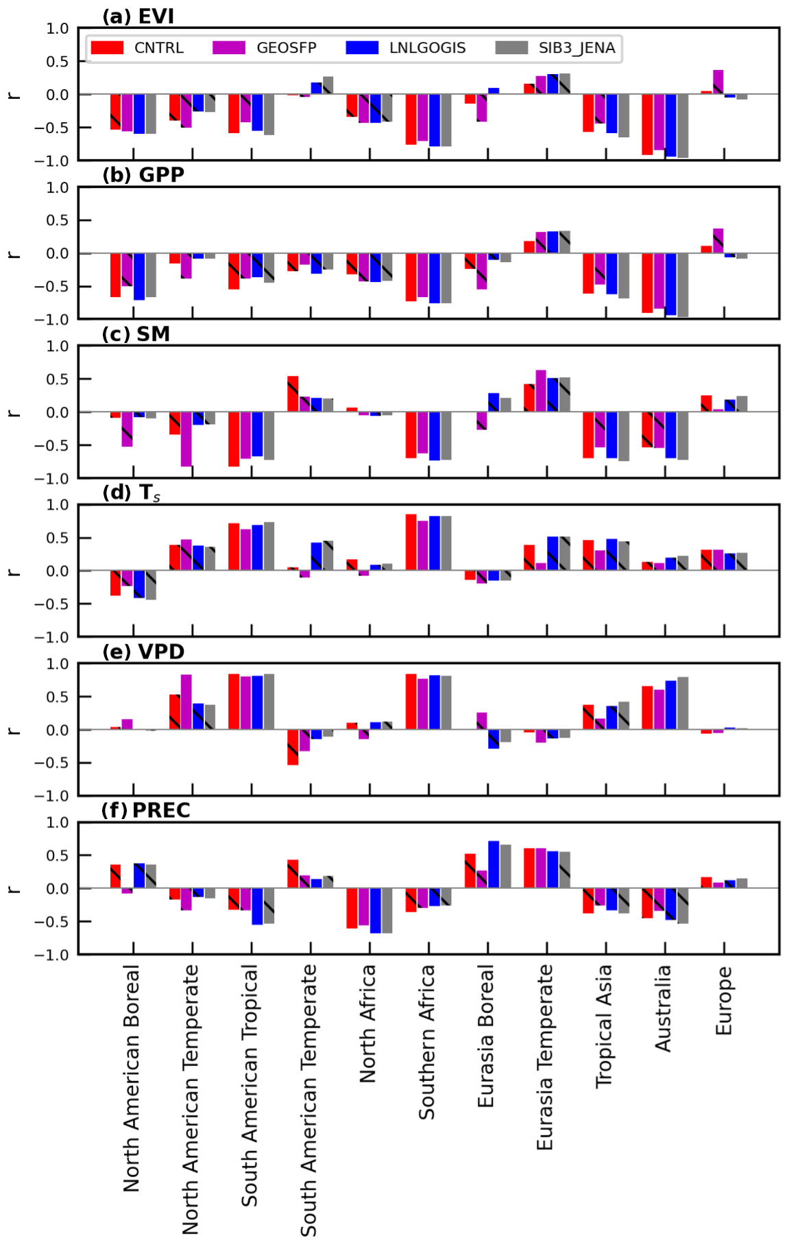 Figure B3Pearson correlation coefficients r between regional a posteriori estimates of net biosphere CO2 exchange anomalies and anomalies of environmental variables, including (a) MODIS EVI, (b) GOSIF GPP, (c) MERRA2 soil moisture, (d) MERRA2 surface temperature, (e) MERRA2 VPD, and (f) MERRA2 precipitation. Correlations with a p value > 0.1 (less significant) are denoted by the black hatching line.